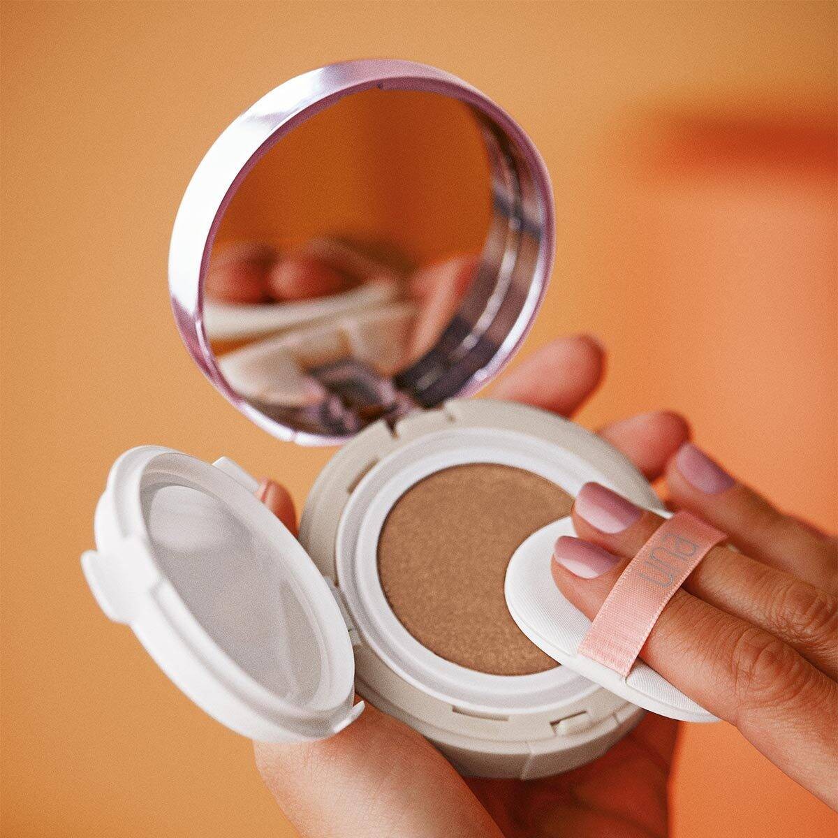 A linha Natura Una já é conhecida por suas lindas embalagens e, com a base cushion, não é diferente. Seguindo o modelo compacto, o produto é feito com um material espelhado rosa, tem um fecho seguro, um espelho de tamanho excelente e uma esponja que encaixa nas regiões menores do rosto.