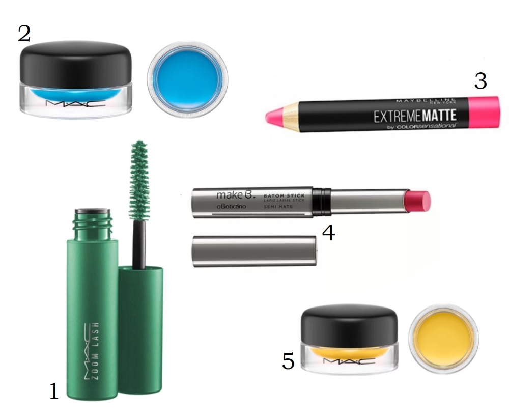1. Mac Zoom Lash, $49,00; 2. Mac Delineador Chromaline Hi-Def Cyan R$ 105,00; 3. Batom em lápis Maybelline R$ 20,00; 4. Make B. Batom Stick R$39,90; 5. Mac Delineador Chromaline Primary Yellow R$ R$105,00