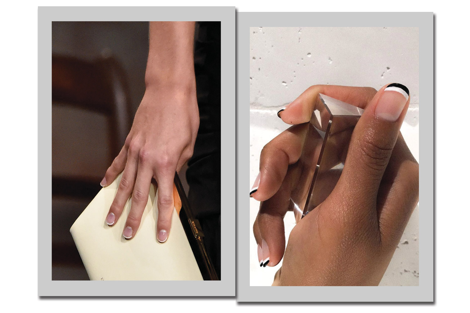 A Alice & Olivia e Khaite (foto), apostaram para seus respectivos desfiles de verão 2020 uma francesinha fininha – apenas a linha branca tradicional, bem fina. O efeito? Alongamento extra, especialmente para unhas curtas. A extraordinária aparência do manicure Tom Bachik é ainda mais chique, graças a uma linha dupla de preto e branco contrastante.