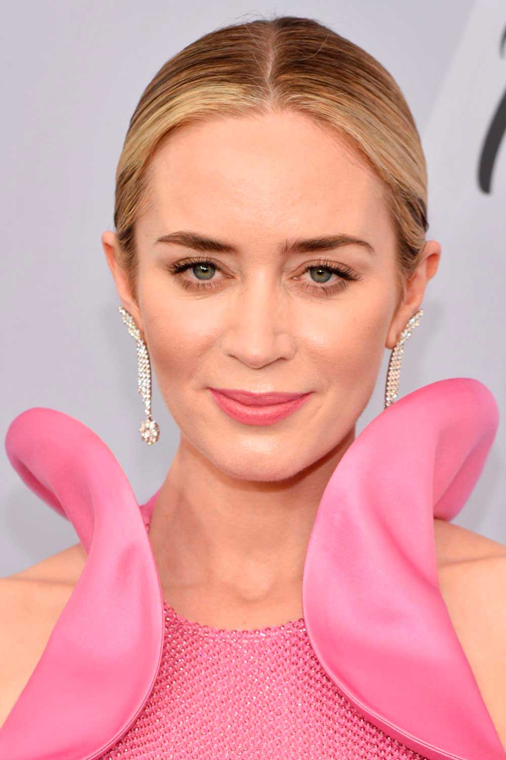 Blunt minimizou sua maquiagem, focando no batom rosa.