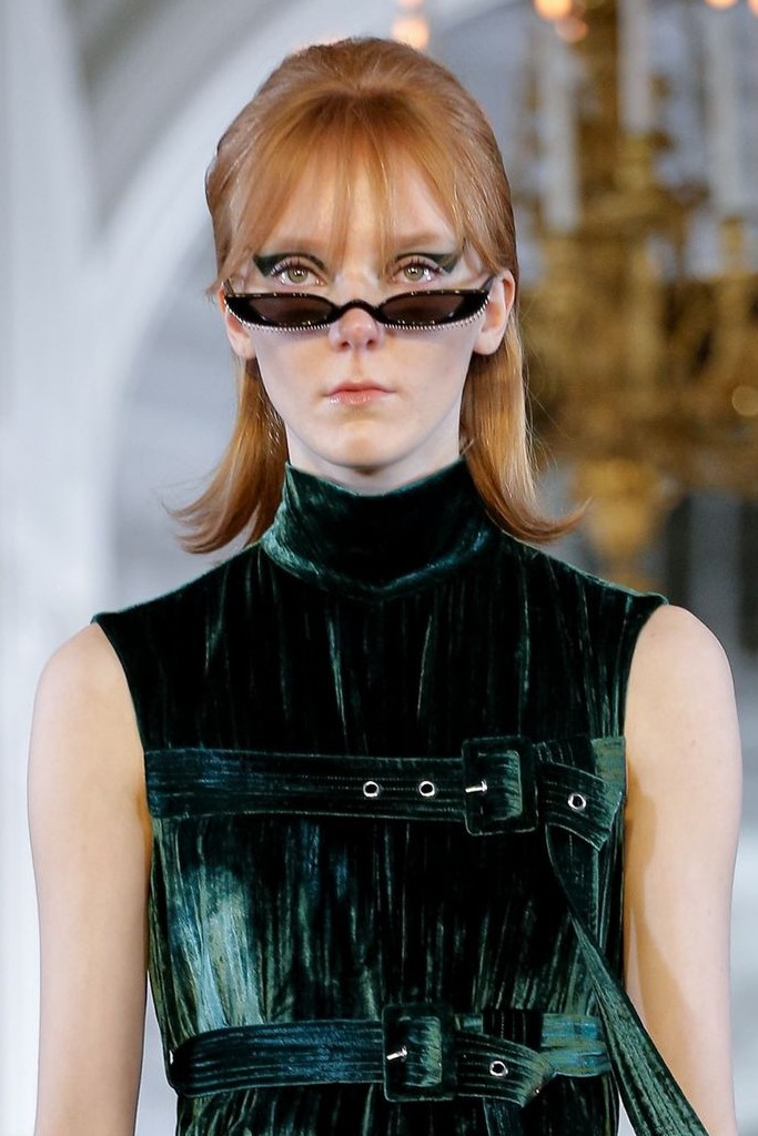 Uma tendência de beleza diferente tem conquistado o coração de grandes fashionistas e, agora, também dominou a passarela: olhos geométricos. Com delineador ou sombra em gel, a ideia é criar linhas e formatos retos acompanhando o formato dos olhos. Para o desfile de Haider Ackermann, Bella Hadid uma versão de delineado que segue reto, mesmo depois do final dos olhos.