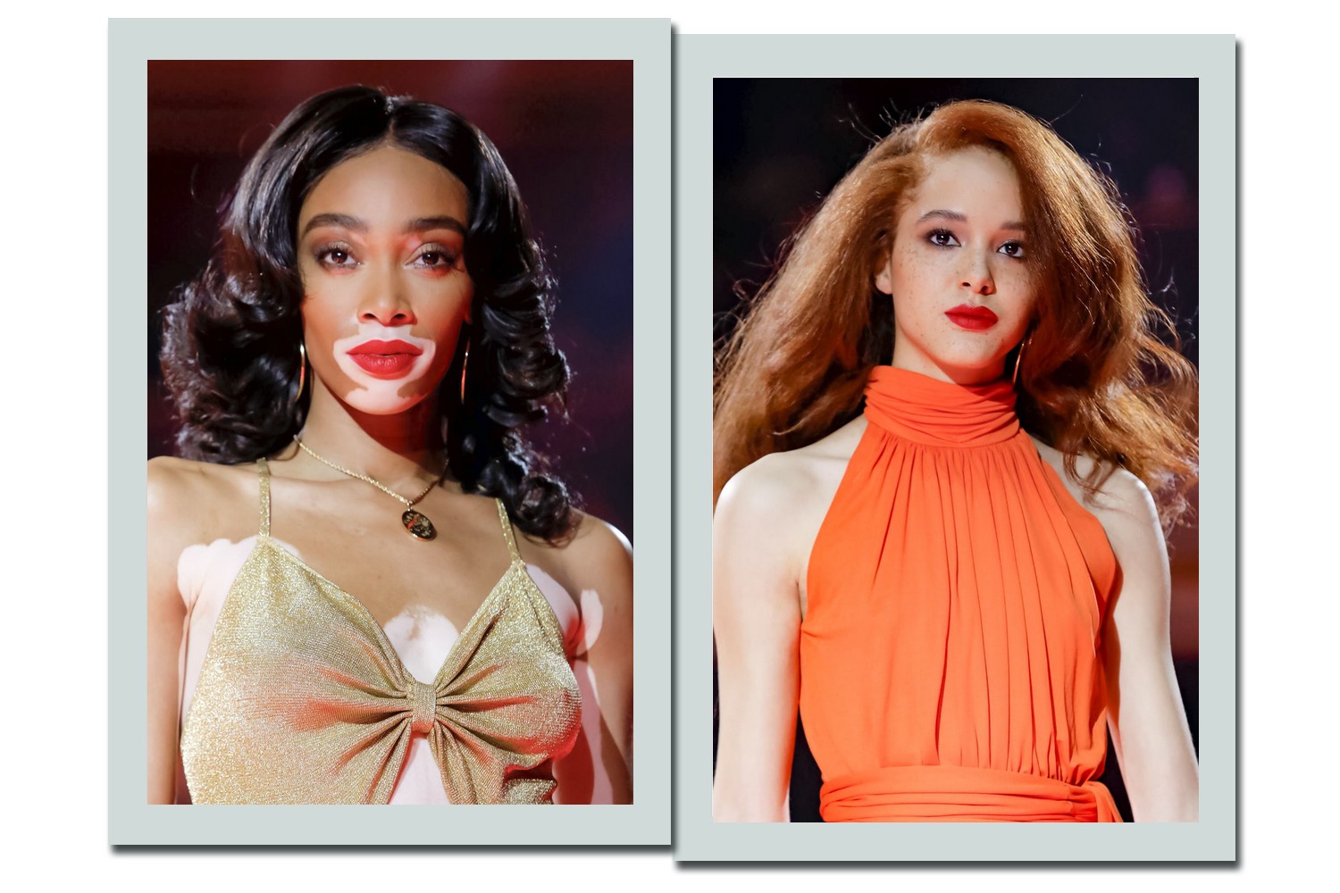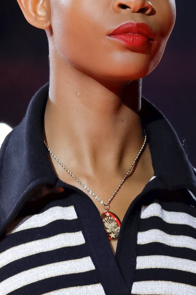Já outras modelos, como Winnie Harlow, usaram o clássico batom vermelho, em uma versão que puxava para o laranja. A cor costuma deixar a maquiagem mais alegre, mesmo quando ela conta com um olho marcado pelo lápis preto. Além disso, a pele das modelos estava bem natural, sem grandes quantidades de contorno ou iluminador e uma base bem leve.