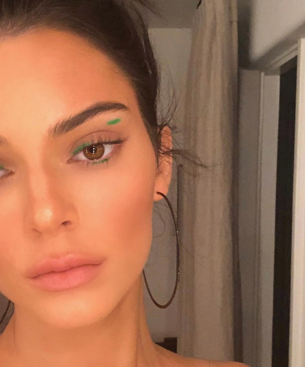 No último domingo (11.11), Kendall Jenner chamou atenção no tapete vermelho do People’s Choice Awards, em Los Angeles, ao usar um delineador verde vivo marcado em linhas assimétricas, como que “rabiscadas” nos olhos, criação da make up artist Mary Phillips.