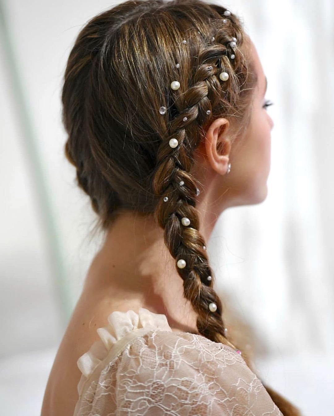 Alice + Olivia também apostou nas tranças duplas e embutidas, mas com um detalhe fun: o penteado foi enfeitado com pérolas e cristais, dando mais vida ao cabelo.
