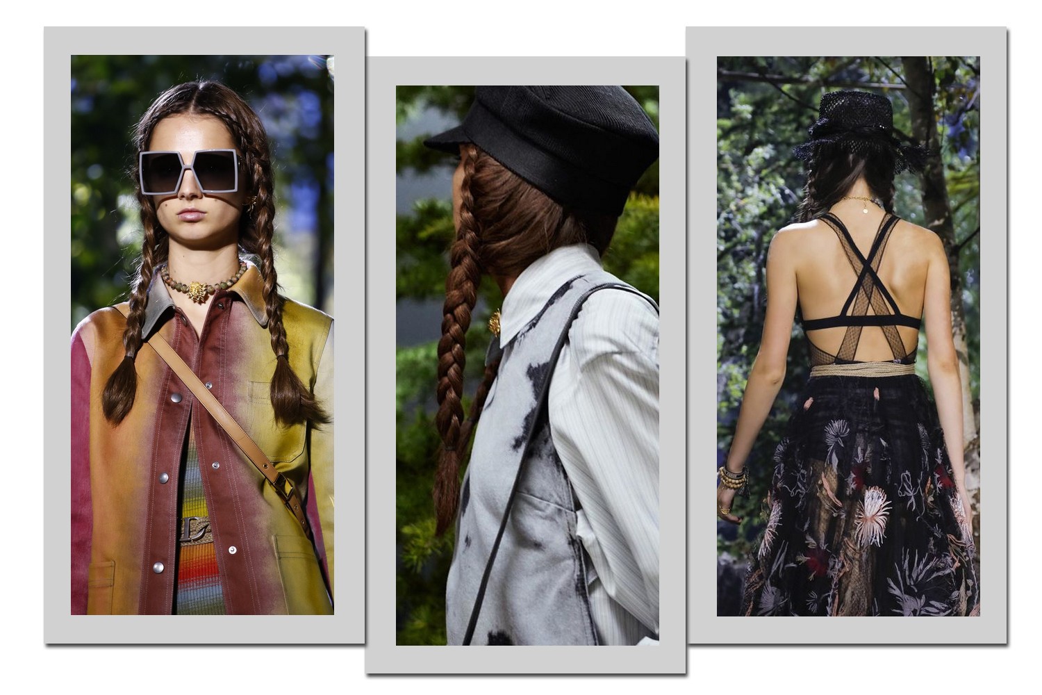 Já Dior apresentou uma versão mais campestre do visual, em que as tranças começavam na parte da frente do rosto, o que fazia com que a parte de trás ficasse mais solta, já que o cabelo ia sendo puxado aos poucos. Além disso, os fios foram presos de maneira mais solta e finalizadas com as pontas retas.