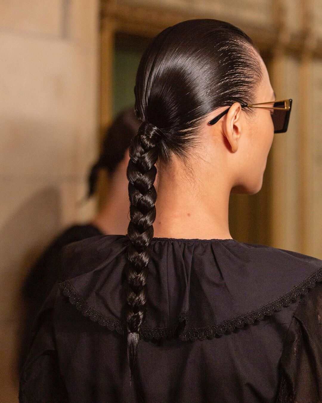 Seguindo o mesmo caminho, a Self-Portrait também optou por uma trança baixa, mas com uma finalização wet. Para conseguir esse resultado, os fios foram puxados para trás e finalizados com um fixador mais potente, como um gel. Essa versão dá uma atualizada no visual, além de um toque mais refinado.