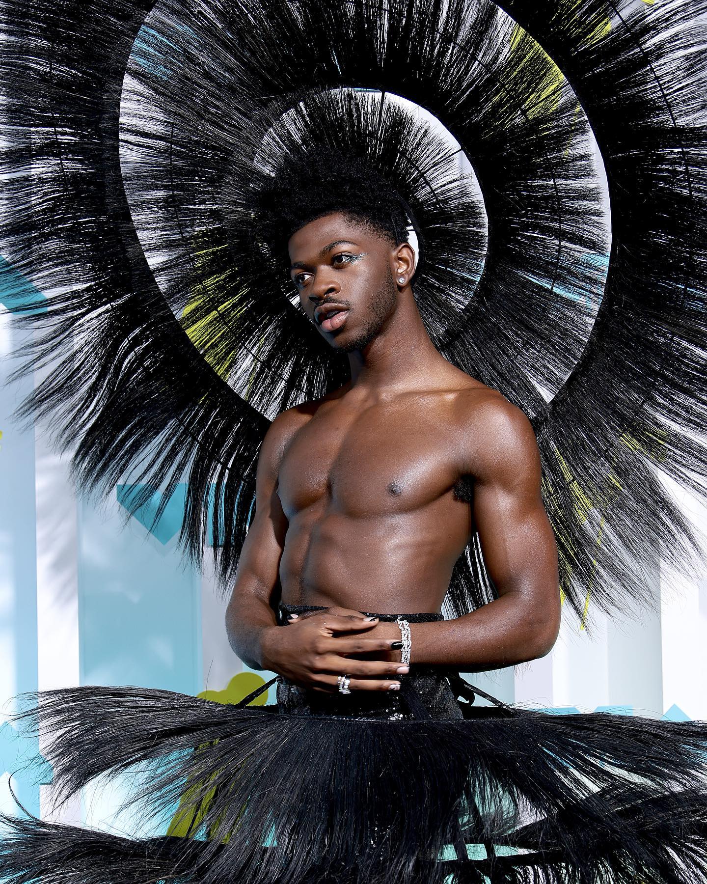 “Se Nicki Minaj subiu ao palco com um laço enorme, Lil Nas X simplesmente usou um adereço gigante de penas pretas, que se camuflavam com seu penteado a ponto de tudo parecer um styling único”, completa Natan.