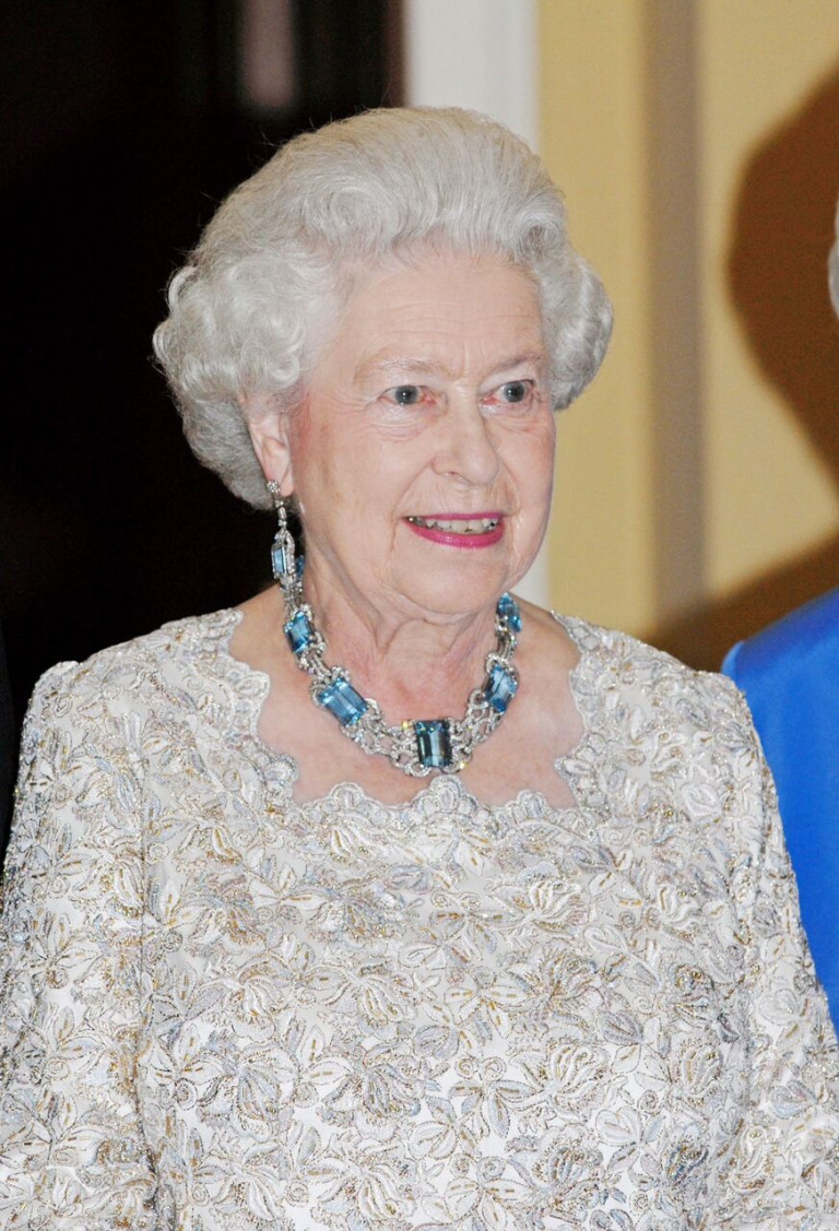 Entre as joias preferidas da rainha Elizabeth estava um conjunto brasileiro, composto por brincos, colar, broche e tiara de pedras águas-marinhas – Foto: Getty Images
