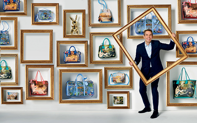Ao mesmo tempo,exatamente pelo próprio humanismo de Manet,você sente uma relação com todos esses heróis e mentores que formaram Manet – e me formaram também. Eu me tornei intrinsecamente ligado a esse rico ciclo humanístico quase infinito. Todas as bolsas Masters foram cobertas primeiro com a série Gazing Ball. Mas como a coleção Masters é muito menor, foquei nas imagens que criariam um diálogo equilibrado, então, pegaria uma imagem mais sensual, como A Odalisca Loira, de Boucher, mas aí você tem na mesma série Ninfeias, de Monet. As bolsas funcionam de um jeito similar à série Gazing Ball. Por um lado, você pode achar que é uma das minhas obras, mas há um certo simbolismo presente, como a interação entre as iniciais LV e o JK, e a presença do meu Rabbit [cada bolsa é adornada com uma tag de couro no formato de um coelho,uma referência à escultura de aço inoxidável de 1986 de Koons). Por outro lado, tudo isso acontece em um espaço mínimo, para reforçar que isso não é sobre mim. Não é sobre minha criação; é um exercício de experiência de humanismo, de estar em contato com sua própria hu-