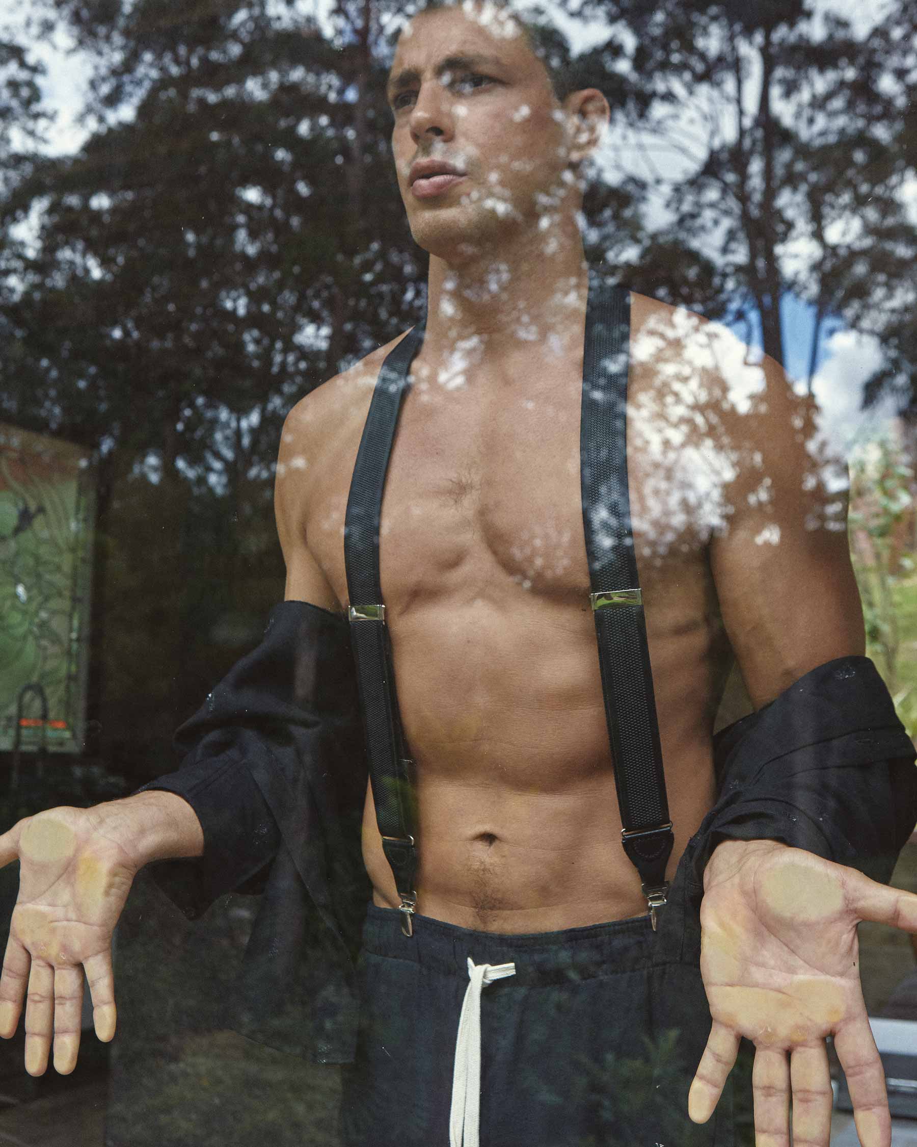 Mesmo que tenha apenas cinco minutos de descanso entre as gravações, estende uma toalhinha no chão, deita, fecha os olhos e foca na respiração, o que acalma sua ansiedade e ajuda a performar melhor em cena. Casados há dois anos, ele e Mariana seguem uma rotina de assistir filmes e séries, além de trocar figurinhas sobre saúde, cultura, meditação e sauna – e, por que não?, até beleza – juntos. Às vezes, faz máscaras faciais com a mulher e acha divertido. Recentemente, experimentou uma de argila mexicana asteca.