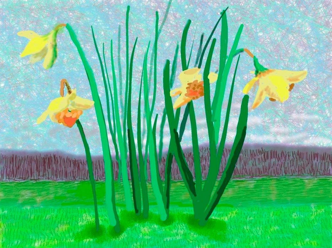 Como Hirst, Hockney também compartilhou 10 novos trabalhos que ele desenhou em seu iPad de sua casa na Normandia. Uma das peças apresenta narcisos amarelos brilhantes, que o artista nomeou “Lembre-se, eles não podem cancelar a primavera”.