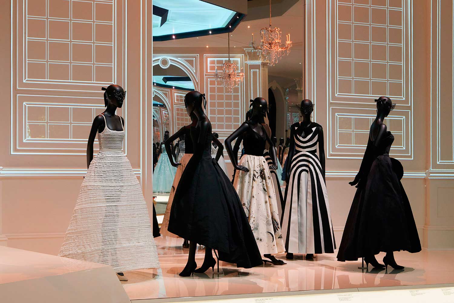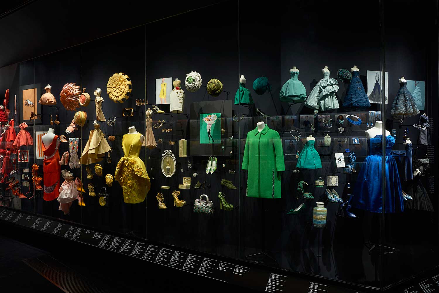 Com objetos emprestados pelo acervo dos Dior Archives, a exposição apresenta mais de 500 objetos, com mais de 200 vestidos raros de alta-costura, além de acessórios, fotografias de moda, perfumes vintage, maquiagem em frascos originais, ilustrações, revistas e objetos pessoais de Christian Dior. A exposição mostra destaques das inigualáveis coleções Couture do V&A, incluindo o icônico Bar Suit, ofertado ao museu pela Dior em 1960.