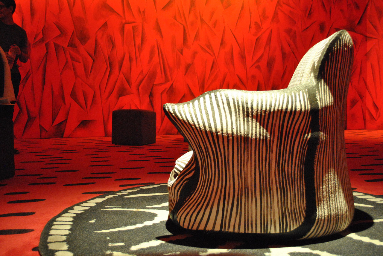 Na “Gran Lámpara”, o living do apartamento do diretor e artista visual David Lynch, em Nova York, é reproduzido por Guillermo Kuitca. Conhecido por seus filmes surrealistas que sempre se tornam clássicos cult, o design de interiores da casa de Lynch vibra na mesma frequência. Carpetes e paredes em vermelho sangue com estampas geométricas e efeitos tridimensionais são pontuados por poltrona e sofás (assinados pelo próprio David) que parecem emergir de uma tela de Salvador Dalí.