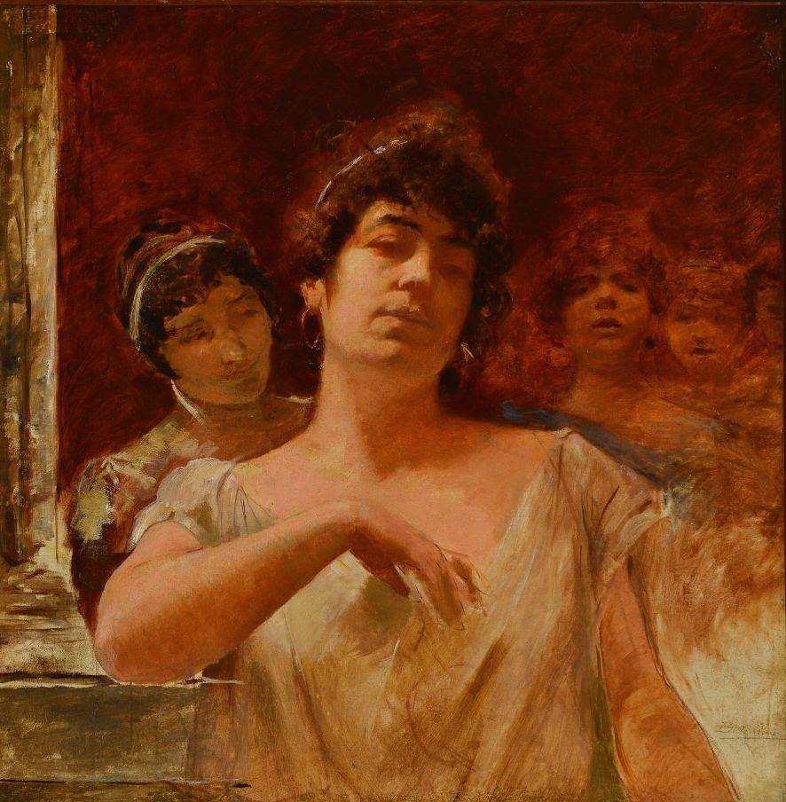 No duo formado por obras de Belmiro de Almeida e João Câmara, a curadora chama a atenção do visitante para a semelhança visual e da composição das telas. Trata-se de “Figuras Femininas” (c.1900), tela construída de forma quase impressionista por Belmiro, e “Langueur do Outono” (1989), do contemporâneo João Câmara. O dueto traz um QR Code que leva o visitante até um depoimento em vídeo de João Câmara, no qual o artista fala sobre a obra exposta, trabalho da série “O Tango em Maracorday” (1989), na qual ele recria, à sua maneira, a saga do assassinato do revolucionário francês Jean Paul Marat por Charlotte Corday.