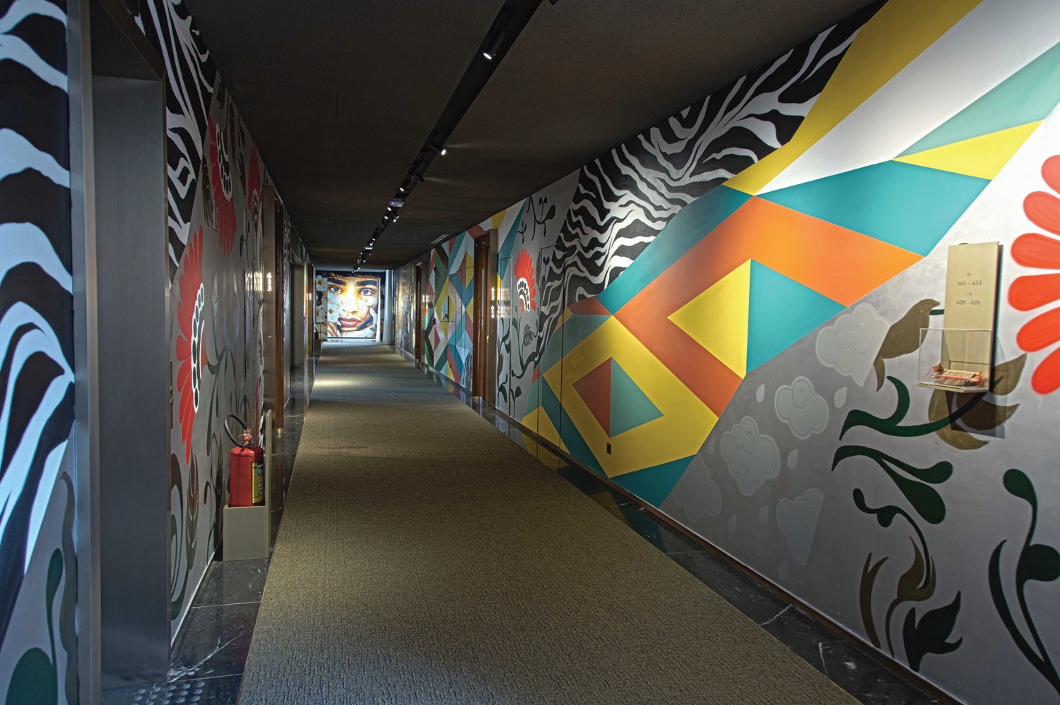Logo nos primeiros minutos em que se entra no hotel, os olhares são atraídos para os dois gigantescos tapetes feitos por Regina Silveira, que mesclam cores e plantas da fauna brasileira. “É um deslumbre, o melhor bem-vindo possível.”