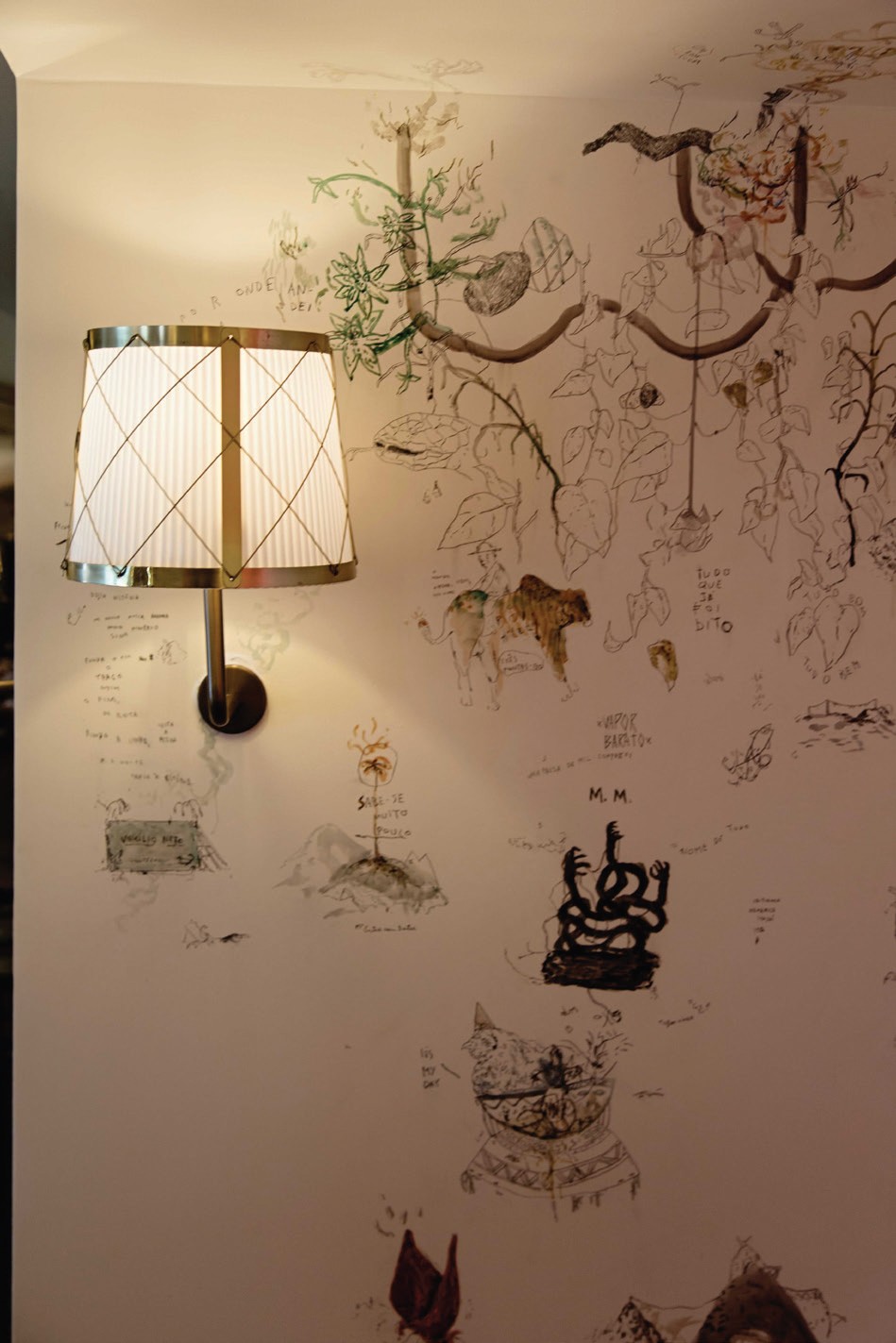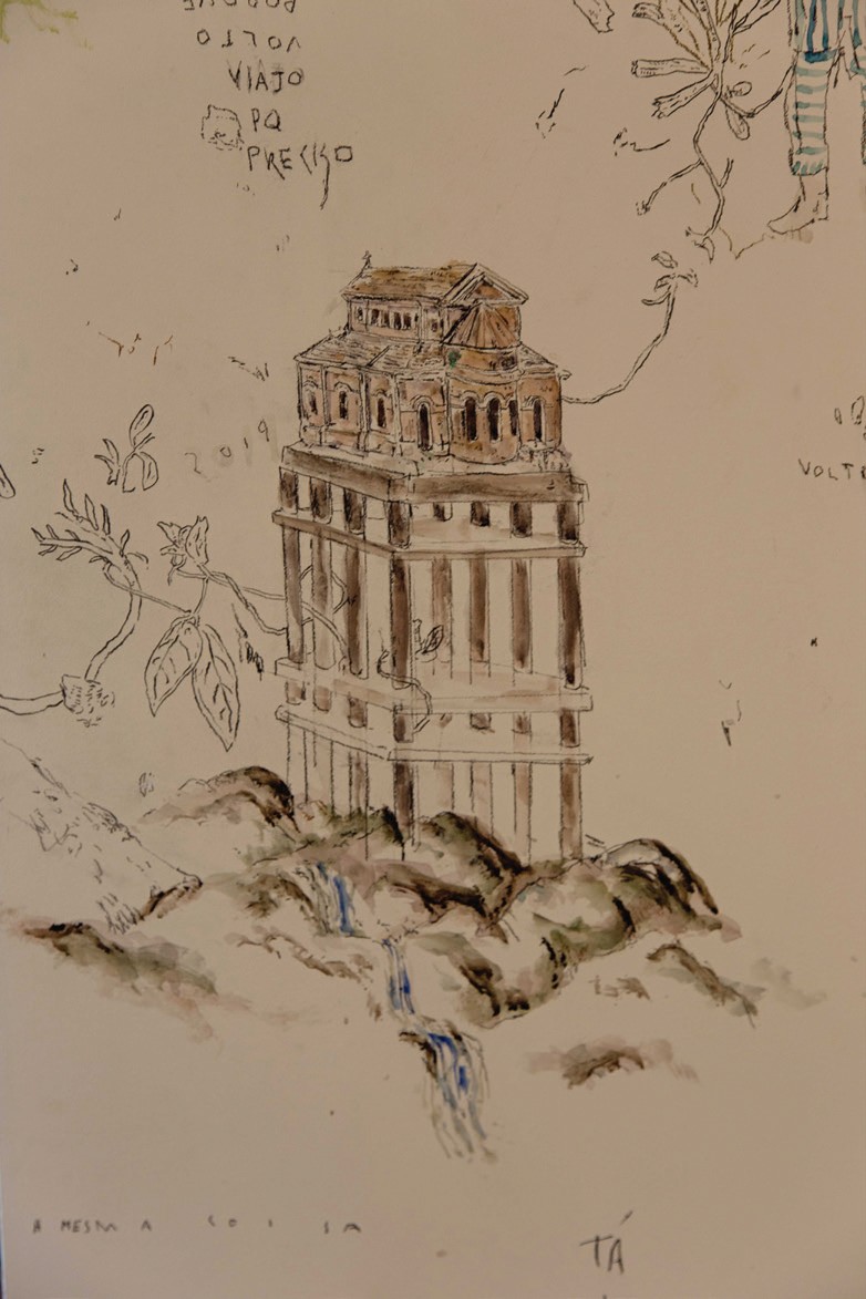 Seguindo o fluxo, as paredes dos elevadores são recheadas de desenhos do artista plástico Walmor Correa, em série na qual ele busca explorar uma etnografia cultural da flora mágica brasileira. “Pegou plantas medicinais e, a partir delas, inventou plantas híbridas com itens humanos. Alucinação pura”, definiu o curador.