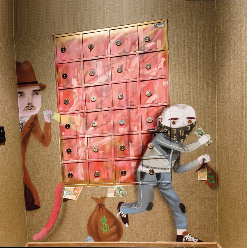 Ao entrar no cofre, somos surpreendidos pela obra do artista urbano Caligrapixo, que rouba a cena por ali, como uma espécie de obra-prima guardada a sete chaves. “É muito especial”, completa Marc.