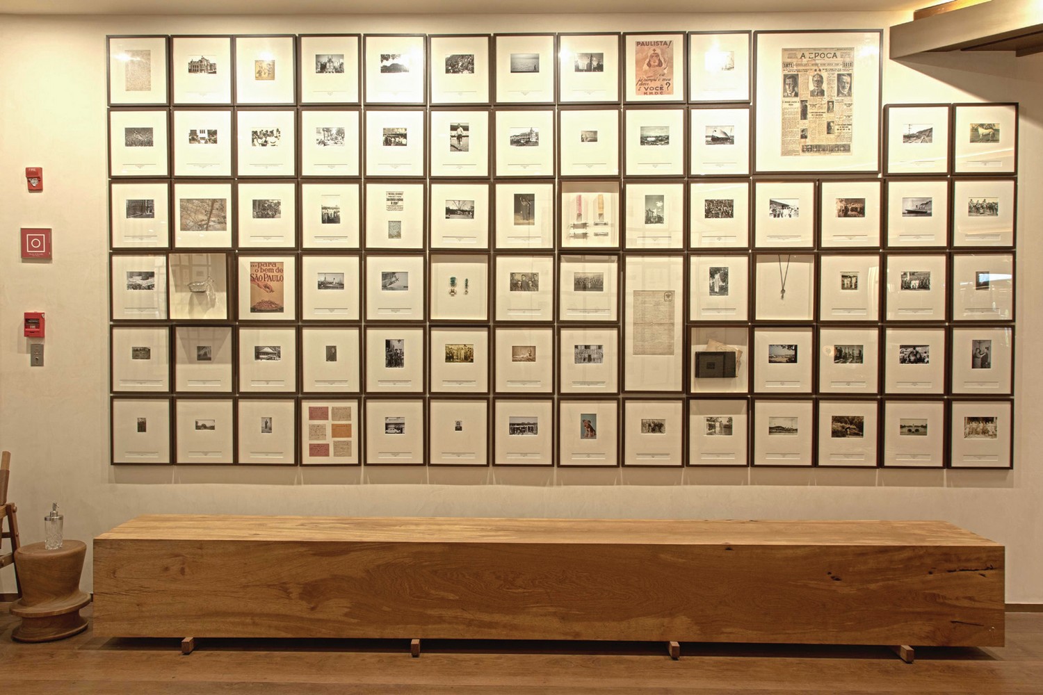 Na sequência, no caminho para o restaurante central do hotel, avistamos na escada que leva para o andar de cima e em uma das paredes da sala de cofres, uma série de obras de miniquadros feitos por Vik Muniz, e que contam a vida do Conde Matarazzo. “É a vida, a memória e as lembranças dele com fotos e diversos outros elementos.”