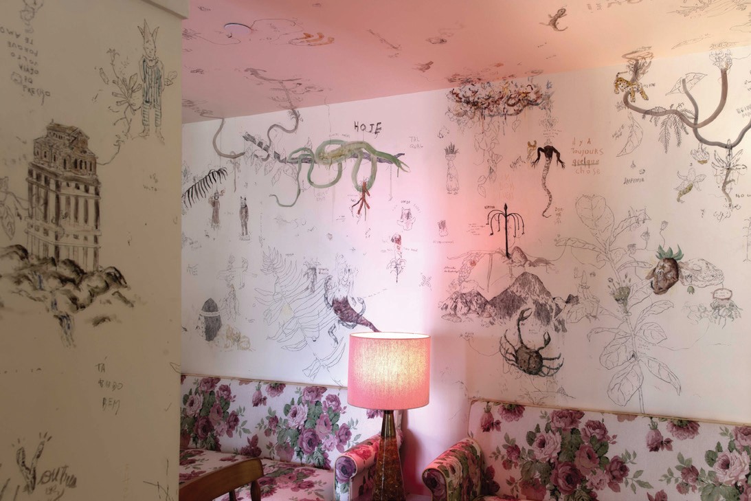 Há ainda obras do artista carioca Daniel Senise, que resgatou a memória do hospital com recortes nas paredes que “emolduram” (a partir de buracos feitos nela) antigos rabiscos e pichações, preservando a história do prédio que ficou desocupado por décadas. “Tudo estava abandonado por mais de 20 anos. Ele veio e escolheu os recortes nas paredes que queria preservar. Um artista de memória: esse é o foco dele”, conta Marc. “Foi o mais difícil de convencer que precisava estar aqui. E deu esse resultado lindo.”