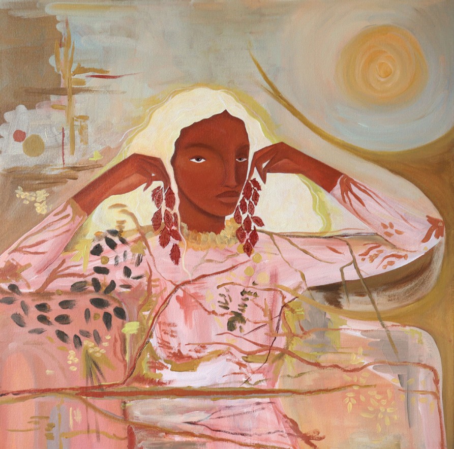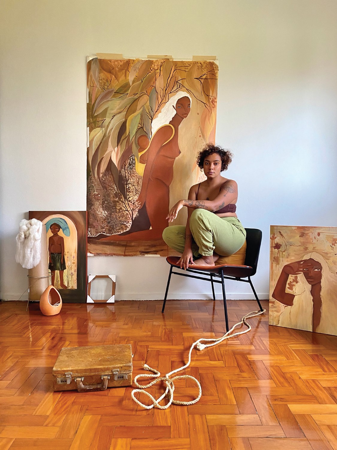 Na nova série de trabalhos, mulheres pintadas em tons terrosos exalam calma. Há sempre um desejo de seguir adiante, mas sem pressa. Por exemplo, uma dessas obras foi muito dolorosa e ela detalha: “Essa mulher carrega um peixe no pescoço, tem flores e fundo em tons arroxeados. Me lembra muito um pôr-do-sol. Ela não está feliz e nem sempre a gente precisa se sentir assim. Nos momentos mais profundos de conexão comigo mesma, estava em tristeza.”