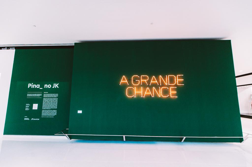 O trabalho “Chance” (2015-17), de Regina Parra (São Paulo, 1984), também utiliza o neon. Nesta criação, a artista se apropria de tal mecanismo para lançar no espaço a temática “A Grande Chance”, que desafia o espectador a múltiplas interpretações ao refletir sobre o que constitui, de fato, “sua grande chance”. O trabalho sugere aquele momento decisivo ao qual todos estão sujeitos. “Chance” é resultado de um desafio pessoal na vida de Regina, que enfrentou problemas de saúde. A artista explora, desde o início da sua carreira, uma multiplicidade de linguagens como pintura, instalação e performance. Questões humanas, a exemplo da imigração, do movimento dos corpos e do feminino, assim como de referências ao ambiente urbano, estão presentes em suas produções.