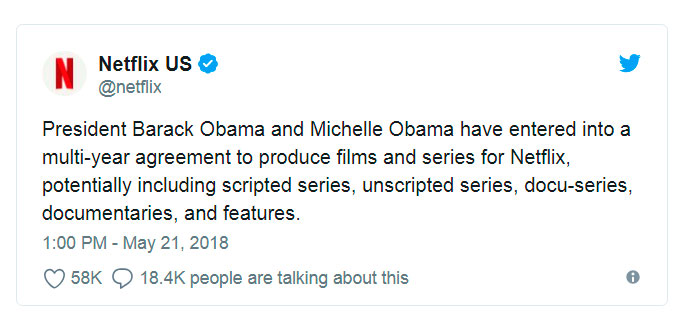 Em sua conta oficial no Twitter, a provedora global de filmes não dá detalhes do que pretende lançar sobre o ex-presidente dos Estados Unidos e sua família, mas anuncia que o acordo vai durar mais do que apenas um ano. É esperar para ver!