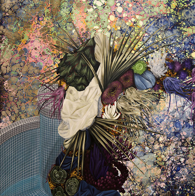 Em sua quarta individual no espaço, Mariana Palma apresenta uma série de trabalhos em fotografia, aquarelas, colagens e pinturas. Muitas delas recentes, que apontam novos caminhos na pesquisa da artista. A partir de composições entre estampas, elementos arquitetônicos e plantas, as pinturas ganham destaque pelo uso da cor. “Comecei a ocupar mais o espaço da tela. Tudo invade, tudo se abre. A composição interage mais com o fundo”, diz Mariana. A mostra tem curadoria de Paulo Miyada, que assina um texto poético para a ocasião.