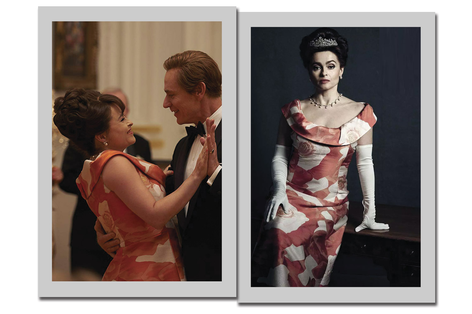 Para noites de gala, nada de pretinhos básicos. Margaret não tem medo de apostar nas estampas, como esse marcante vestido floral com decote ombro a ombro, usado com luvas longas.