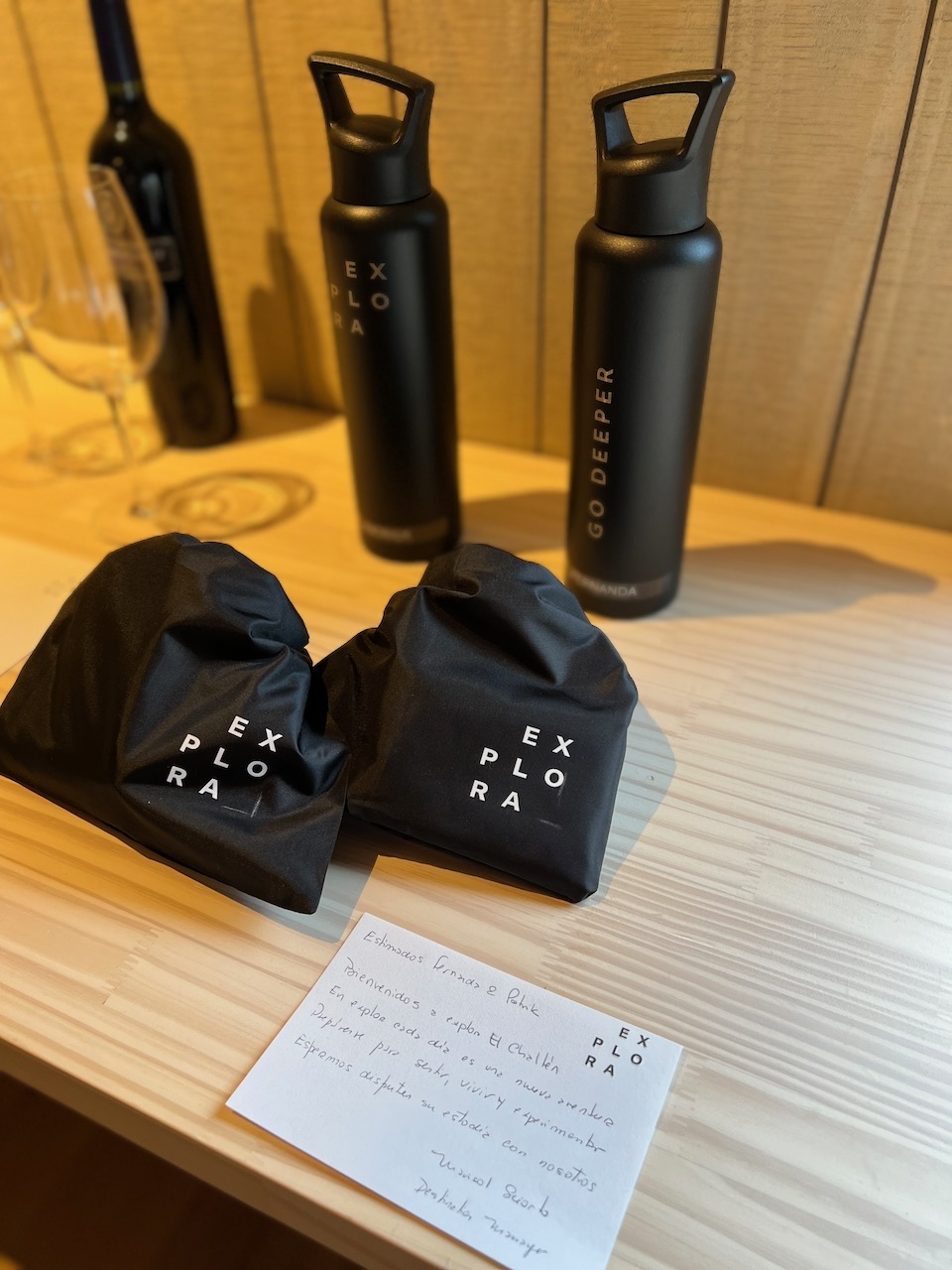 Os kits para as expedições incluem garrafas para serem usadas nas trilhas, cremes labiais e curativos para uma eventual emergência – delicadamente lembrando a quem chega que a aventura começará em breve.