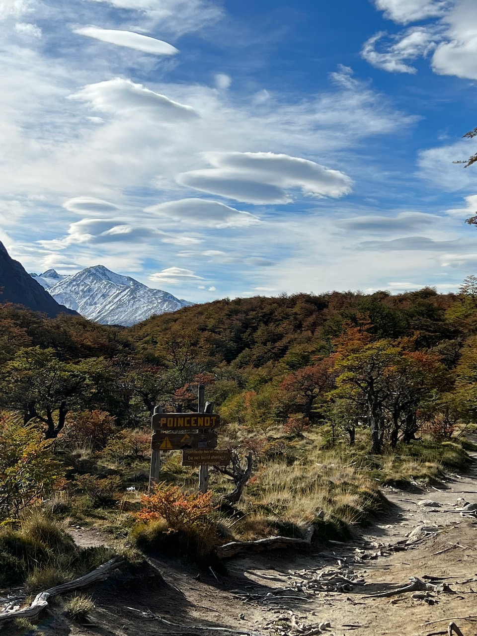 A trilha segue até a subida para a laguna, uma paisagem belíssima, com um bosque de árvores legnas e ñirres, o Rio Blanco e o Fitz Roy que aparece, com vista limpa, majestoso.