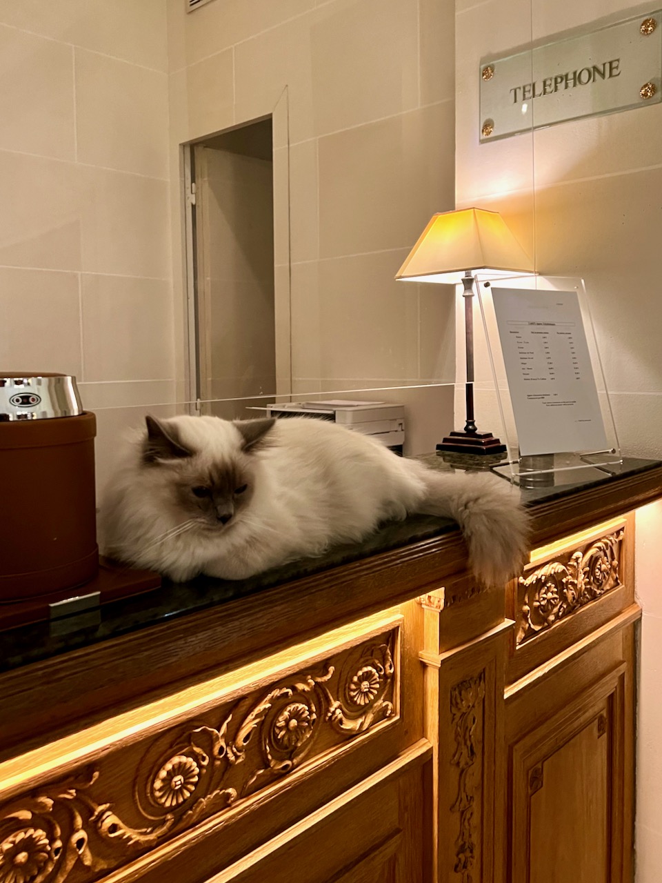 A simpática tradição de ter um felino residente no hotel começou com Fa-raon, um gato da Birmânia que durante 11 anos desfilou sua elegância pelo foyer do Le Bistrol. Com a aposentadoria do pai, chegou ao hotel seu filho, Socrate, para ocupar seu posto e encantar a todos com seu charme e meiguice. Pois, Socrate é verdadeiramente apaixonante e não resisti em brincar um pouco com ele após o jantar, já a caminho de nosso quarto.