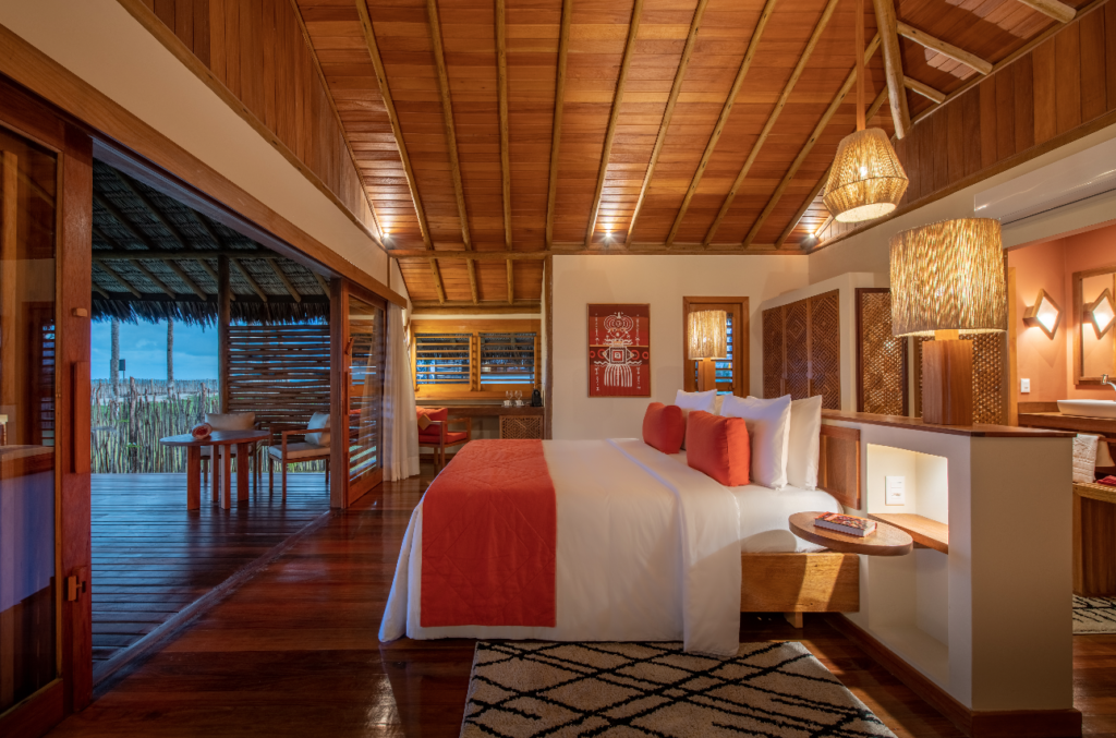 Para qualquer canto que você olhe, seus olhos se deparam com verdadeiras obras-primas compostas pelo design feito sob medida e com olhar brasileiro para o local, complementado pela natureza, que é sempre esplêndida por ali. O design é convidativo e integra a cultura indígena, com peças feitas em madeira por artesãos locais do Ceará.