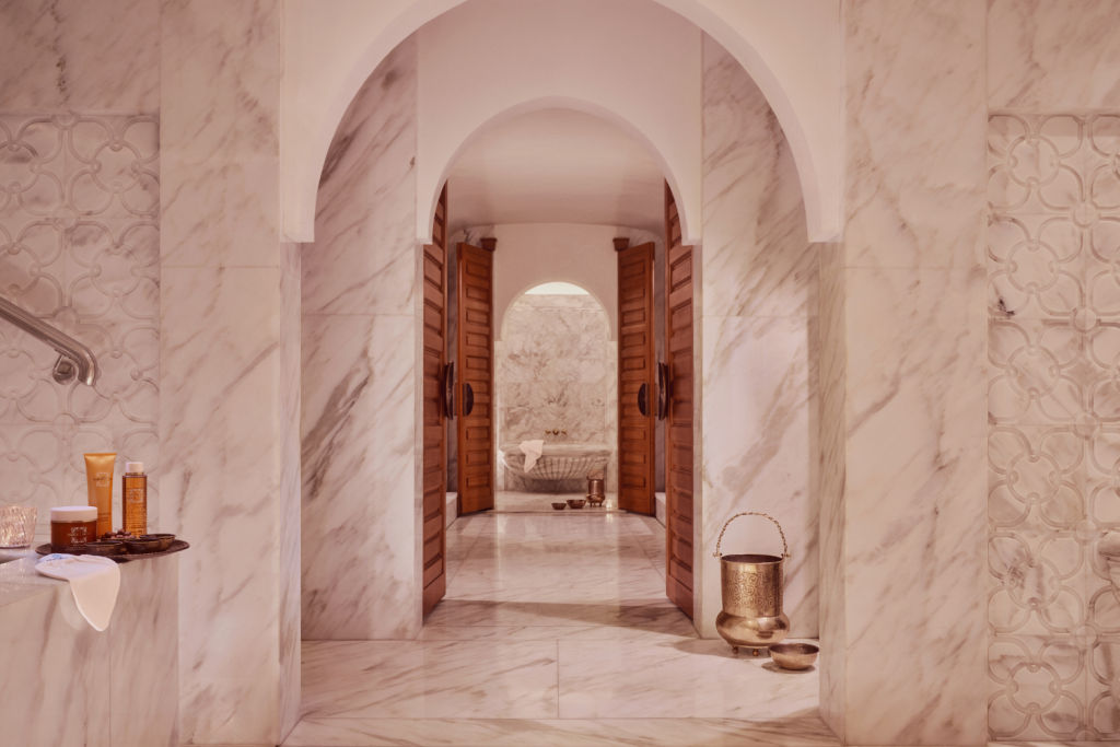As assinaturas do spa formam um mosaico entre rituais ancestrais e tecnologias de ponta. O hammam, verdadeira joia da casa, propõe uma jornada de purificação com elementos que são parte da alma marroquina: argila ghassoul do Atlas, açafrão de Taliouine, rosas de Kalaat M’Gouna. Já os tratamentos corporais desfilam entre texturas nutritivas e esfoliações sensoriais, enquanto os faciais transitam do anti-idade suíço da Bellefontaine ao poder oxigenante do Cactéa da MarocMaroc.