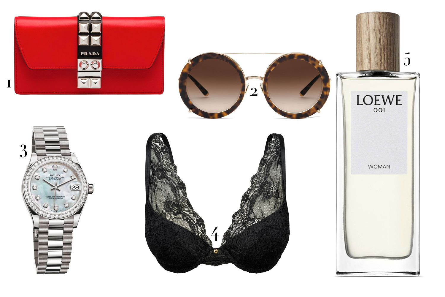 (1) Porta-celular, Prada, R$ 3,8 mil; (2) Óculos, Dolce & Gabbana para Luxottica, R$ 2.120; (3) Relógio com diamantes, Rolex, preço sob consulta; (4) Sutiã de renda, Hope, R$ 149; (5) Perfume 001, Loewe, R$ 496 – Fotos: Divulgação
