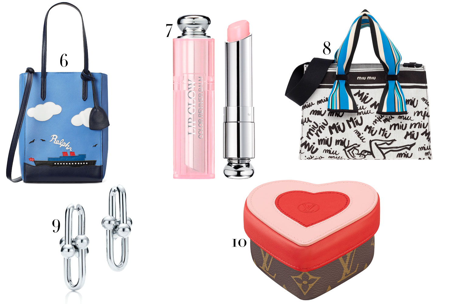 (6) Bolsa de couro, Ralph Lauren, R$ 4,8 mil; (7) Batom Dior Addict Lip Glow, Dior, R$ 159; (8) Bolsa estampada, Miu Miu, R$ 4,5 mil; (9) ​Brincos com elos, Tiffany, R$ 4.230; (10) aixinha de couro, Louis Vuitton, R$ 2.860 – Fotos: Divulgação