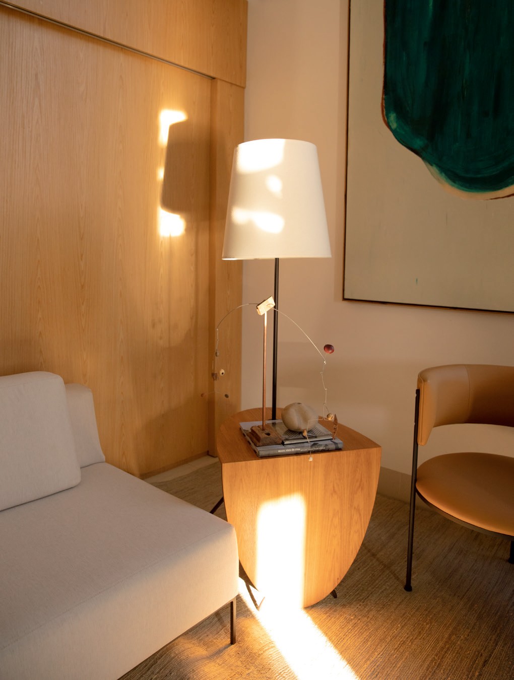 O sol da manhã entrando pela janela e refletindo sobre os objetos da casa, dando a eles vida e uma iluminação especial, é um de seus momentos preferidos. “Isso me exercita artisticamente. É um preparo e um relaxamento para o dia que vai começar.” Deixar a luz entrar é quase um resumo dos dias de infância vividos ao ar livre no sítio da família, em Tocantins.