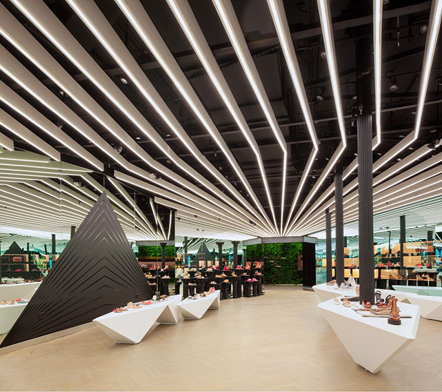 O espaço de exposição dos produtos também recebeu a tecnologia de LED e tem sua decoração transformada de acordo com o ritmo das luzes. Pirâmides de acrílico pendentes, colunas gregas e mobiliário de corian branco servem de apoio para os calçados e acessórios.