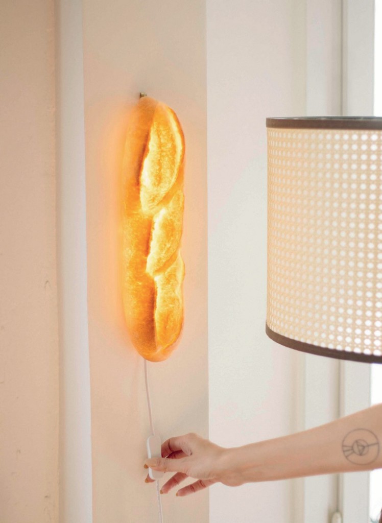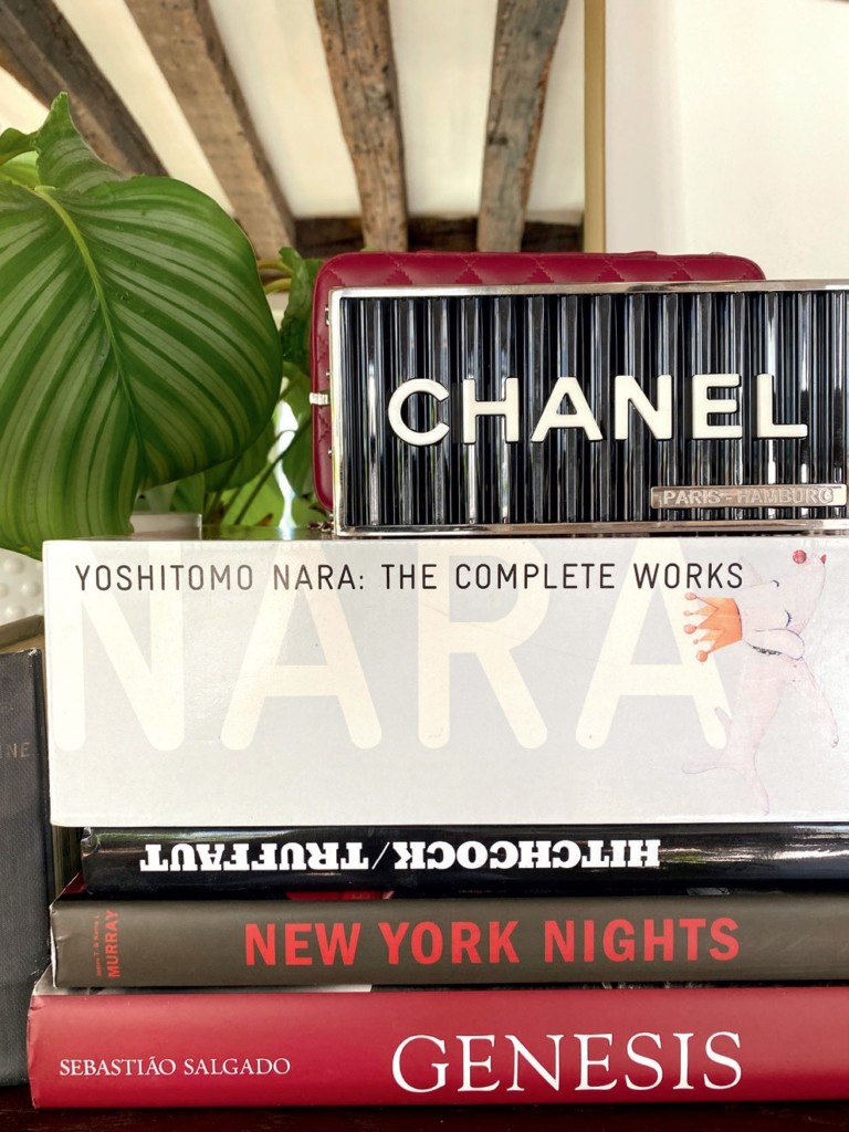 Ela se mudou para seu apartamento há dois anos, depois de ser inicialmente atraída pelas vigas de madeira escura que cruzam o teto da sala, e começou a compor um espaço repleto de plantas, velas Cire Trudon e louças de porcelana da Astier de Villatte. Cada um de seus objetos de arte, ela explica, tem “um significado especial ou um pouco de história”: há uma pintura de seu olho feita por um artista francês que costumava atuar nos desfiles da Chanel; uma peculiar lâmpada em forma de baguete pregada na parede veio do artista japonês Yukiko Morita, que transforma pão de verdade em luminária.