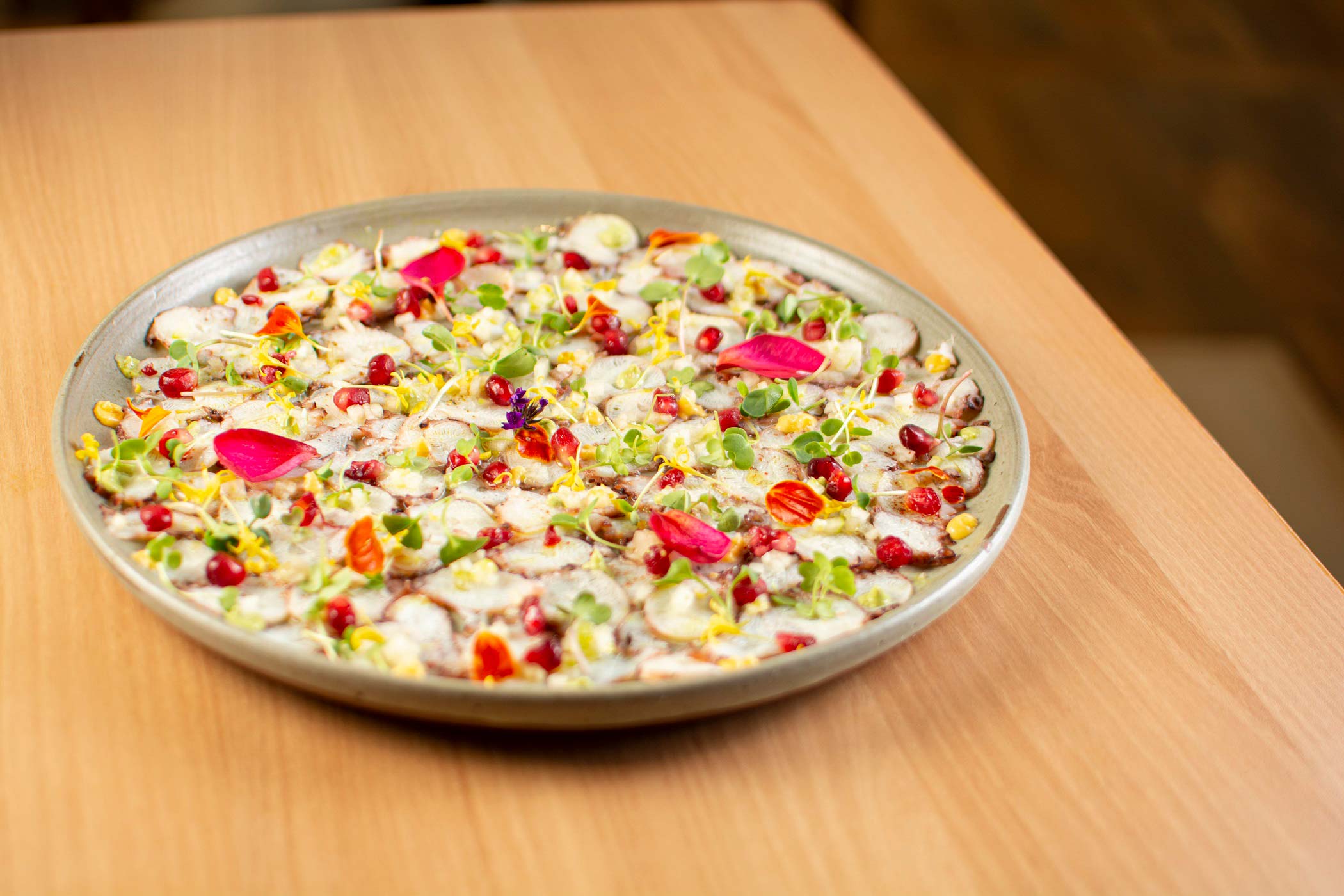 Após os drinques, chegou a hora da degustação. Inicialmente, foram servidos para nós entradas e pratos frios, sendo muita coisa da culinária japonesa, que é uma das especialidades do restaurante. O primeiro prato a ser servido para nós foi o carpaccio de polvo. Eu achei um prato muito bom, pois eu não sou muito fã de polvo, já que não gosto muito de sua consistência. Como era cortado bem fininho, ficou semelhante a um sashimi de peixe branco, e o tempero utilizado também era bem gostoso. Foi um bom prato para iniciar a degustação.
