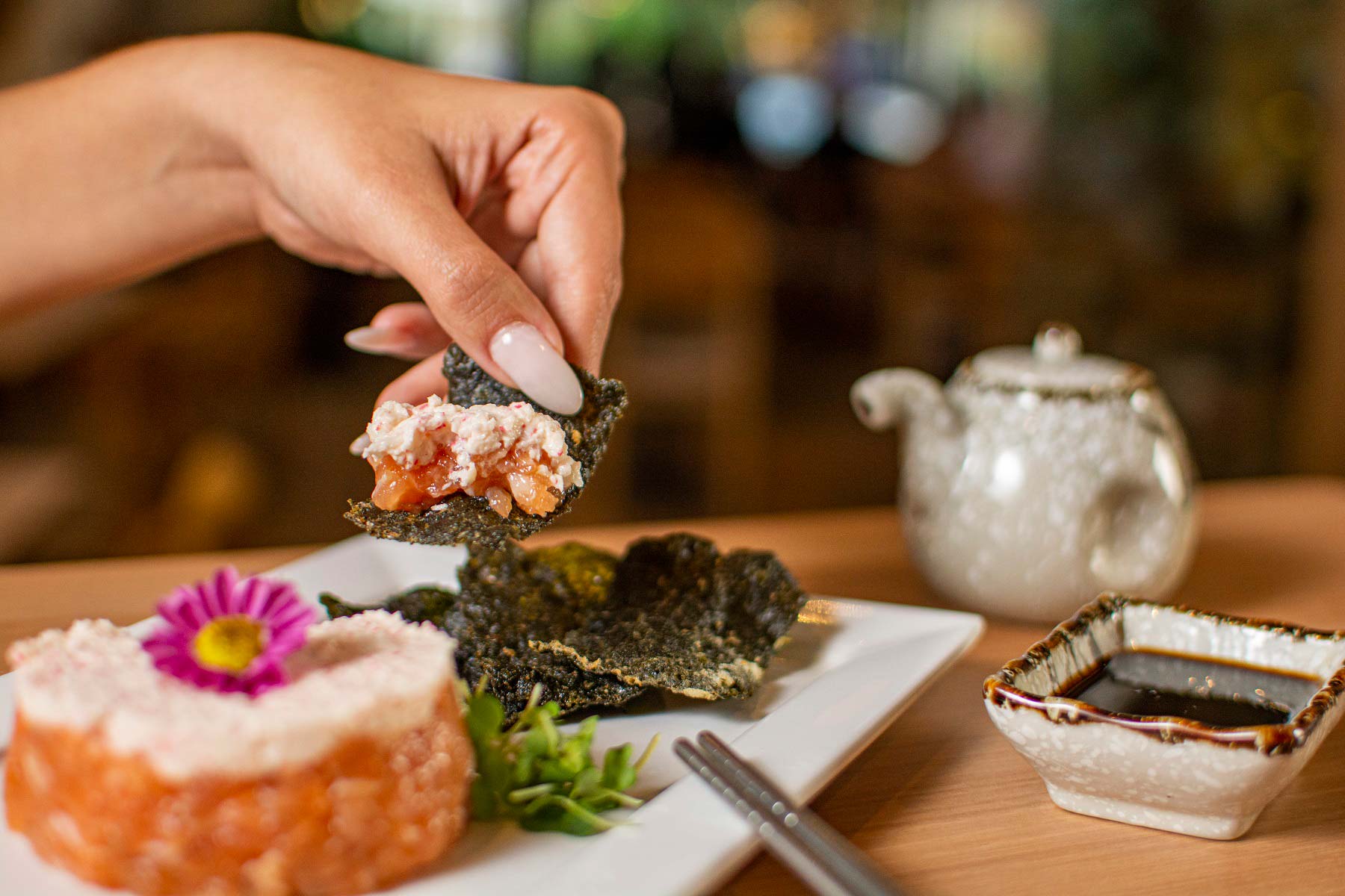 Logo após pedirmos os drinques, fomos contemplados com uma porção de Tartare de Salmão com pasta de Ovas de Capelin. Achei muito boa, especialmente porque nunca havia comido Tartare anteriormente. Essa porção ainda acompanhava Nori Chips, que eram como se fossem chips de algas, e nelas você colocava o tartare dentro e depois comia. Achei muito gostoso, pois adoro esses pratos que consistem em algo crocante, como nachos e chips, em que você coloca em algum molho ou pasta.