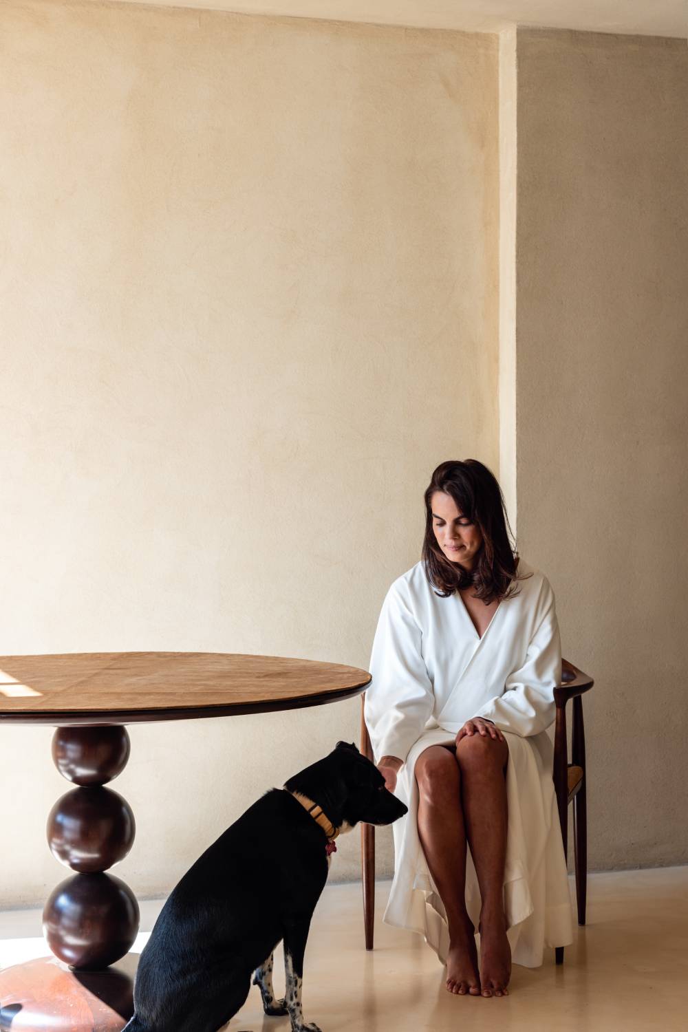 O apartamento em que vive com a filha Ana, de 15 anos, e a mascote Bethânia – um borador, mescla de border collie com labrador – ocupa 250 metros quadrados, exala simplicidade ao mesmo tempo em que transborda personalidade. A sala generosa, entre os quartos, garante certa privacidade. Como as entradas (sem portas) ficam de lados opostos, você não sabe quem entra ou quem sai. “Não existe um corredor de passagem e, sim, uma oportunidade para um ambiente de convivência. Essa sala se conecta a uma maior.” Além dos quartos, complementam a planta as salas de jantar e de estar, uma cozinha e um ambiente de trabalho e estudo, separado das áreas comuns. O apartamento foi completamente modificado desde que foi comprado, em 2020, mas o interessante é que poucas paredes foram removidas. “Não queria corredores para ampliar espaços, porque o arquiteto (português) Álvaro Siza mencionou, certa vez, algo que nunca esqueci: ‘Devemos nos questionar por que moramos em corredores de medidas estabelecidas.’ Então, digamos que o alargamento do corredor em sala foi uma licença poética, uma provocação do projeto”, diverte-se.”Reformulamos a forma de se pensar o uso dos espaços. Isso está mais atrelado ao exercício do pensamento do projeto do que a obra em si”, conta ela, ao ter criado um ambiente naturalista cheio de luz.
