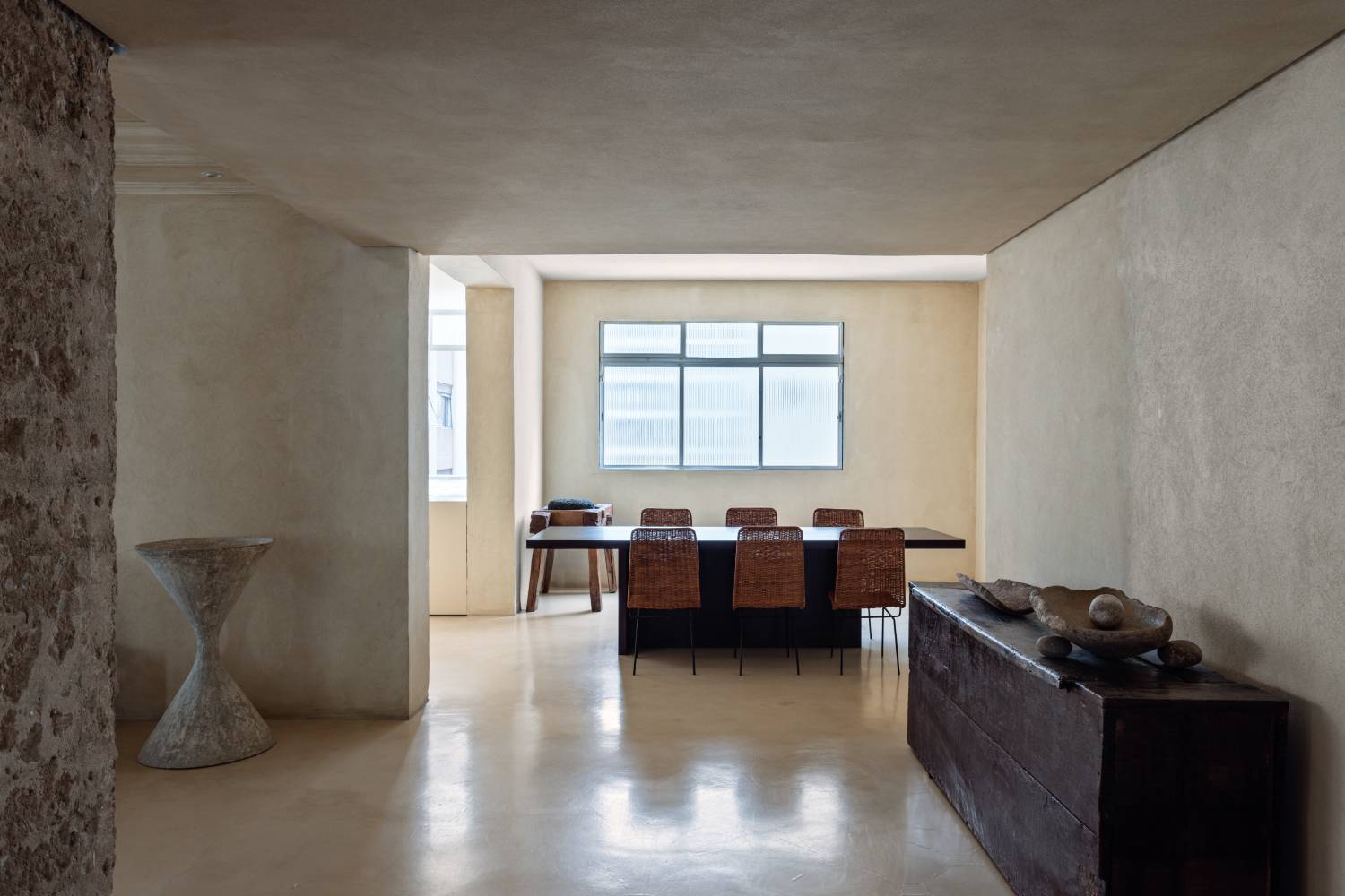 Todas as alvenarias e pisos foram feitos com pigmentação natural de areia, vinda da Bahia, garantindo uma experiência tátil e aconchegante, além de cenário neutro para dar destaque ao artesanato e às peças assinadas. O chão tem concreto no piso, areia projetada nas alvenarias, cuja luz muda no decorrer do dia, e madeira nos detalhes. “E os concretos existentes deixamos aparentes”, diz. Cada peça conta histórias de vida – da Amazônia ao Peru, passando por Etiópia e México – e entrega suas referências no design. Os garimpos se mesclam aos trabalhos de arte contemporânea e móveis de época. Na sala de estar, convivem esculturas de José Bezerra e uma cadeira de Lina Bo Bardi (projetada para o SESC Pompeia), além da Cadeira Alta, do artista Rodrigo Silveira, e o vaso-ampulheta Spindel, em concreto, de Willy Guhl – dos idos de 1950. Sobre o sofá de linho paira uma instalação da conterrânea Brisa Noronha. Na sala de jantar, uma obra de arte do baiano Mano Penalva – seu vizinho – sobre mesa vintage, também cinquentista, além de cadeiras de vime do designer italiano Carlo Hauner, referência para os modernistas brasileiros. Mariana esconde em seu quarto um par de cadeiras do dinamarquês Hans Wegner posicionadas ao redor da mesa de Etel Carmona, escultura oversized de Jacqueline Faus e cadeira Girafa, de Lina Bo Bardi, Marcelo Ferraz e Marcelo Suzuki. Todas as peças atravessaram os anos, tesouros de muitas viagens, principalmente para a África e outros destinos, onde pode explorar a arquitetura e as construções vernaculares. “Existe uma escada Dogon, do Mali, que, para mim, talvez seja o mais simbólico (da casa). Sou fascinada por escadas, sempre um marco. Precisa carregar um senso histórico e não somente ser elemento de conexão do subir e do descer”, acrescenta.