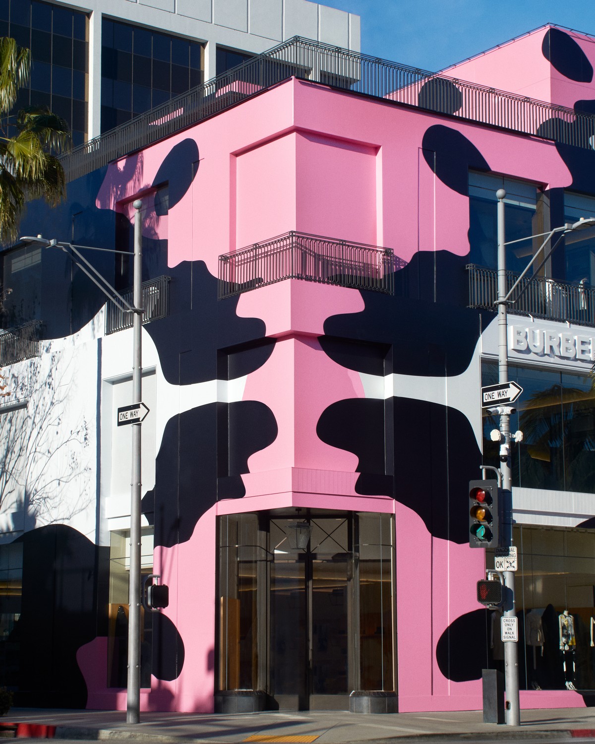 A fachada exterior do prédio foi envelopada por uma pintura abstrata caleidoscópica, evocando formas de camuflagem em um tom rosa chiclete, preto e branco – referência às vívidas estampas que aparecem nas coleções masculinas e femininas. Uma topografia escultural brilha através das vitrines como um pano de fundo para os looks da passarela, evocando a fantasia.