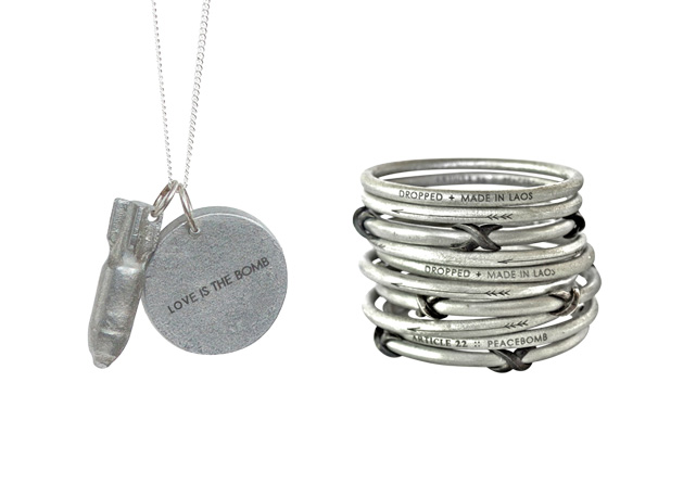 Há oito anos, a designer Elizabeth Suda deixou o namorado em NY e foi se aventurar pelo Laos, para trabalhar com tecelões locais. Ali, encontrou o país mais bombardeado per capita da história,vítima da guerra do vizinho Vietnã – cerca de 80 milhões de bombas seguem ativas no solo, e um sem-fim de destroços convivem com campos de arroz. Lançando mão de artesãos locais, Elizabeth teve a ideia de criar acessórios e joias a partir dos restos de metais bélicos. Nascia a PeaceBomb, primeira linha da marca social Article22, parceria da designer com a empreendedora social Camille Hautefort. “Transformamos horror em beleza”, diz Camille,“fazendo objetos que traduzem nosso ideal de mundo”. Além de gerar renda local, a marca doa fundos para a remoção de explosivos. Pulseiras,colares,braceletes e anéis com o mantra Love is the bomb são vendidos em trendy shops pelo planeta, nas pop up da Article22, em NY e Tóquio, e online – elas entregam no Brasil. E estão de olho na gente:“Faremos uma coleção baseada em uma história do seu País”, adianta Camille, prometendo revelar essa bomba para a coluna, em breve…