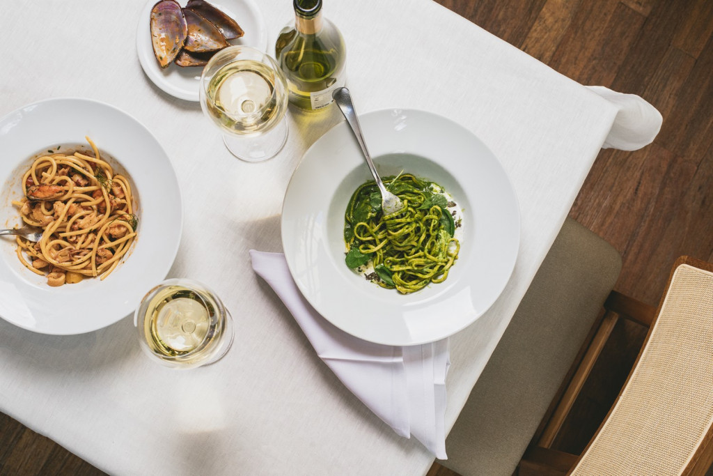 Bucattini profondo mare e tagliolini ao pesto de castanha (massa fresca, pesto de castanha-do-Pará, raspas de limão-siciliano e stracciatella) – Foto: Bruno Geraldi/Divulgação