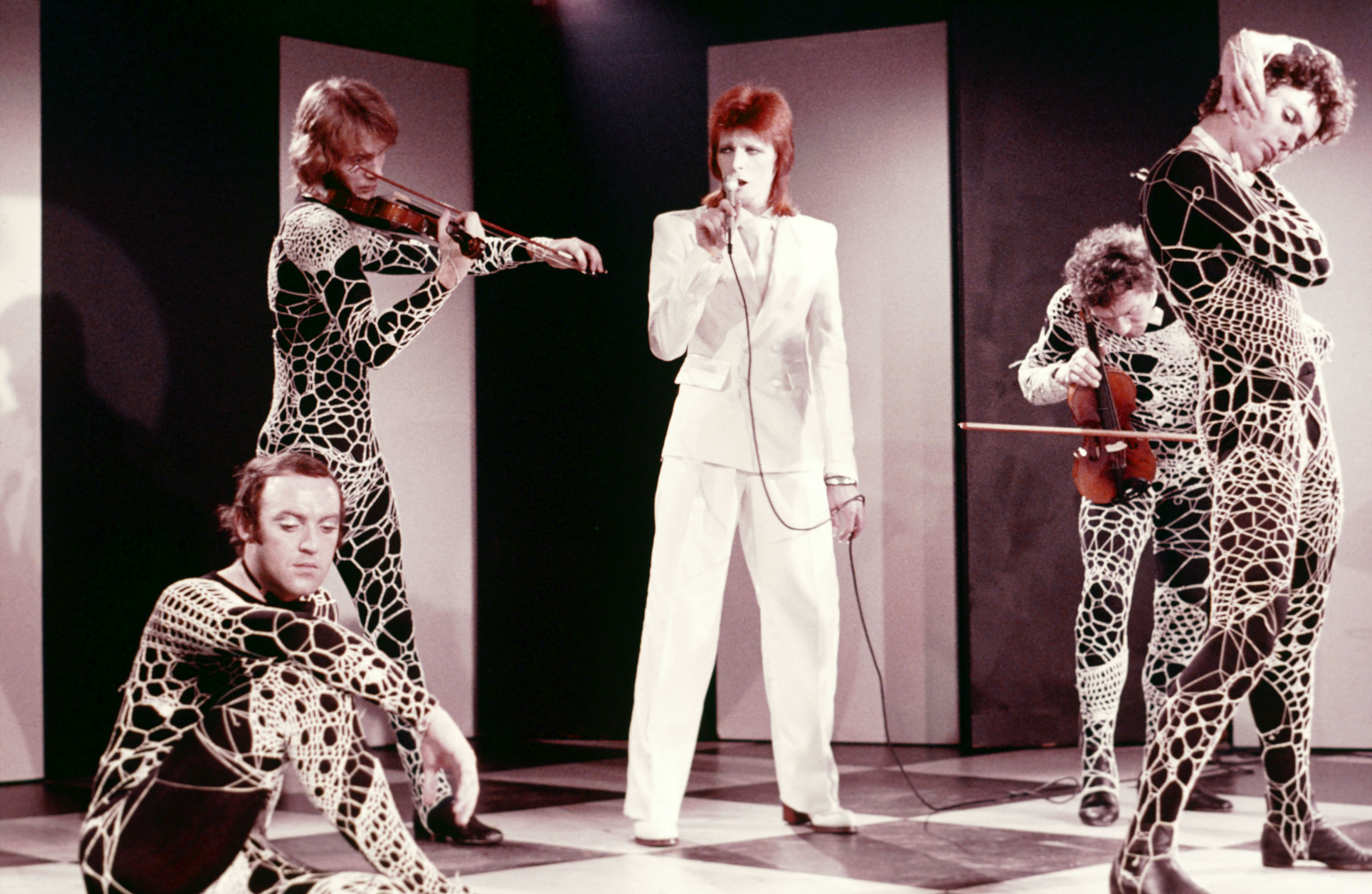 David Bowie como Ziggy Stardust usava peças femininas, como as do estilista Kansai Yamamoto. Foi o designer japonês quem elaborou os quimonos e as peças genderless que o ícone usava, ajudando-o a inventar o estilo glam rock. Já o famoso hairstyle foi inspirado em uma das fotografias de campanha de Yamamoto.