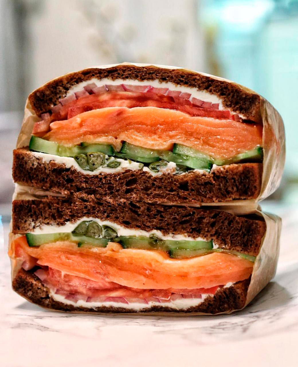 Um clássico sanduiches do chá da tarde, com a trindade sagrada de salmão defumado, pepino e salada de ovos - Foto: Divulgação