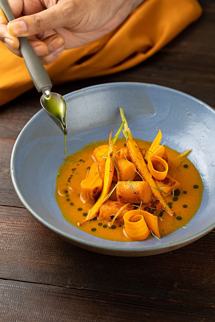 Na cozinha não se usa nada industrializado, somente ingredientes orgânicos, e os preparos de molhos, pães e temperos são artesanais. Açúcar refinado é proibido e queijos e chocolates são veganos. O frango é sustentável e até uma maisena orgânica foi buscada para o preparo do nhoque de cenoura, um dos pratos principais.