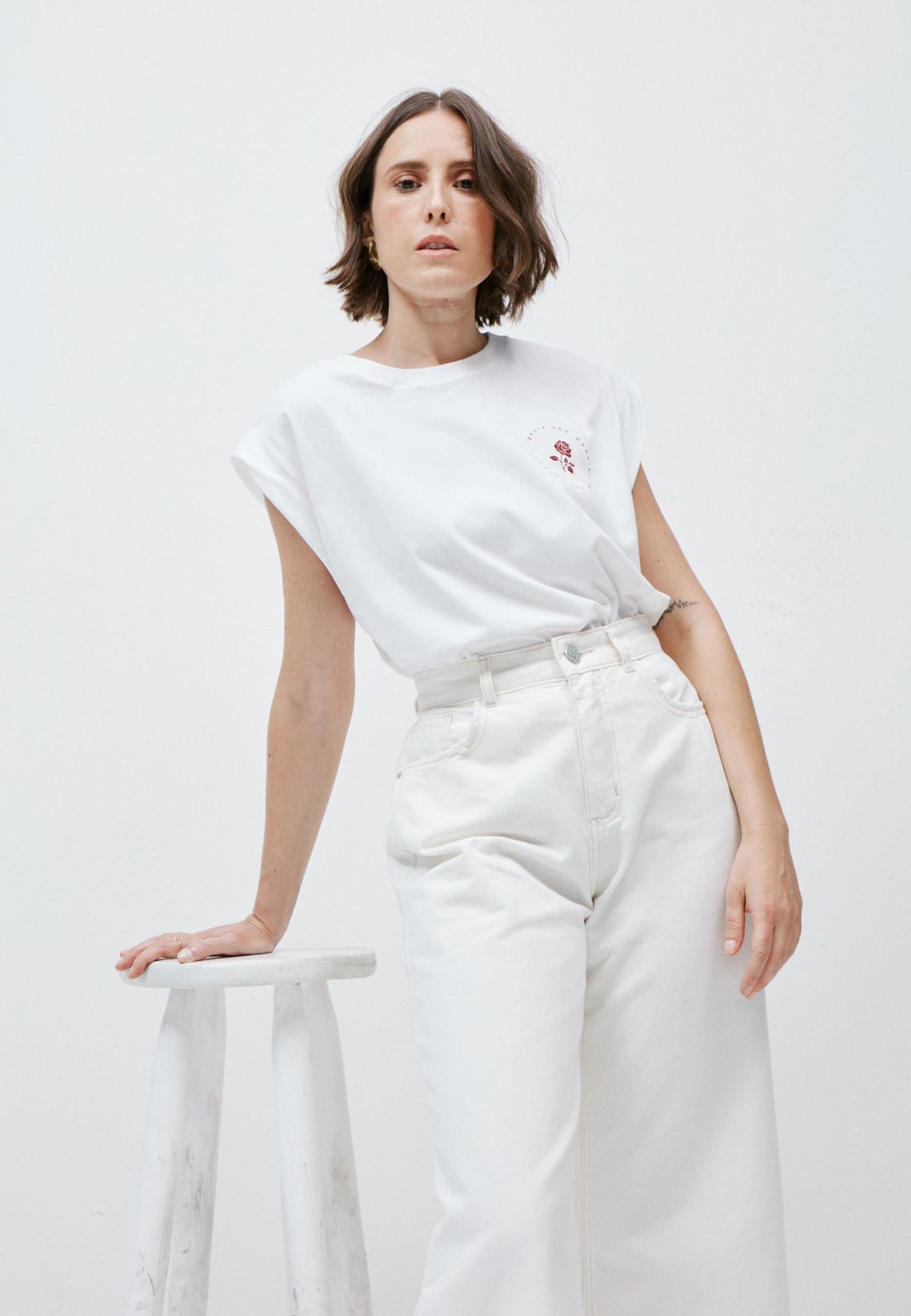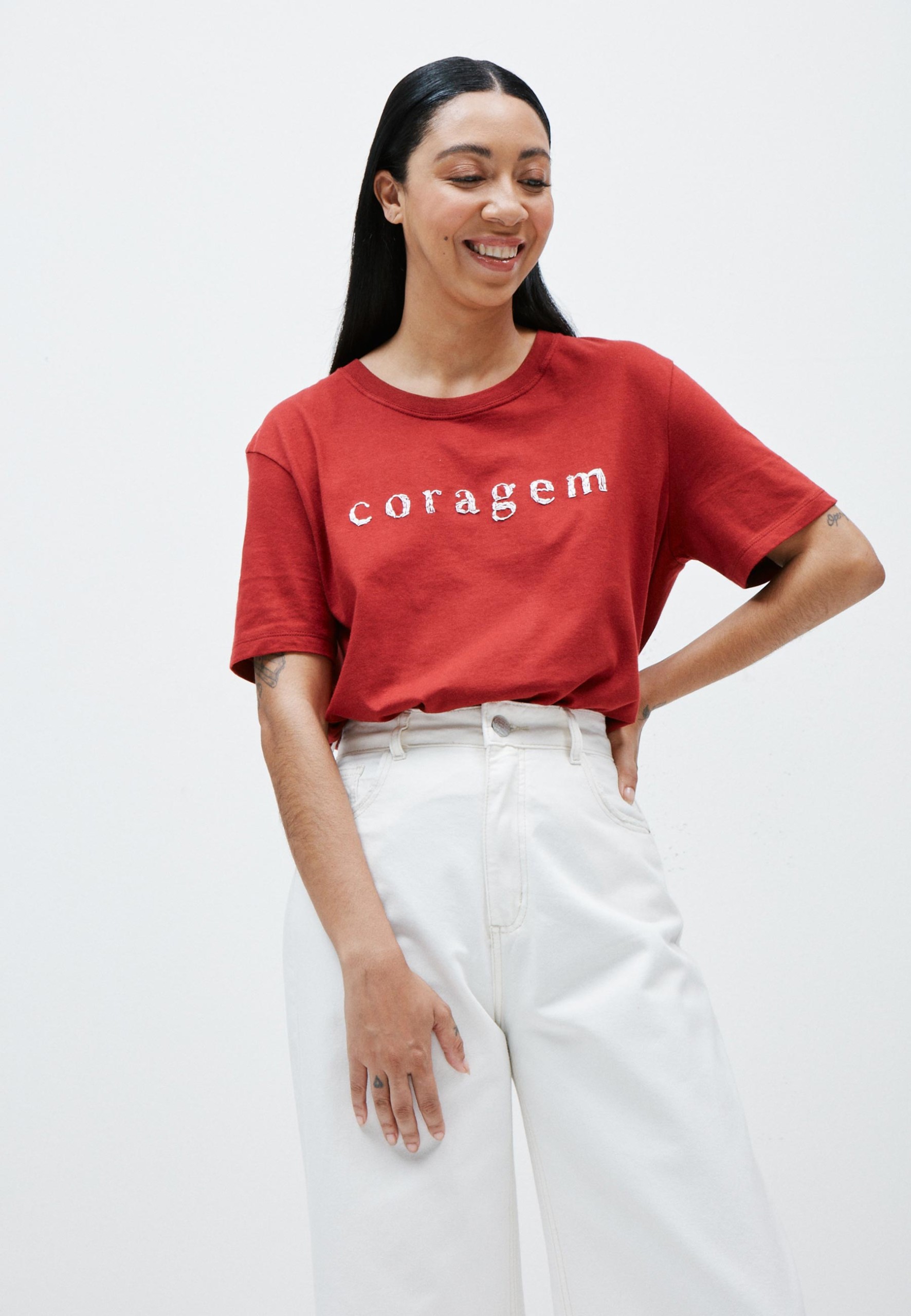 “Criei mensagens inéditas que transmitem amor-próprio, união e empoderamento feminino nas conhecidas camisetas Hering.”, conta a artista. “A ideia é que as peças também sejam lembranças. O ato de presentear é estreitar relacionamentos, irmandade, solidariedade e respeito. Quando você dá um presente, você acaba dizendo ‘estou aqui’. Se presentear é um ato de amor, presentear alguém quem você ama, estreita laços. É o que nos une”, complementa.