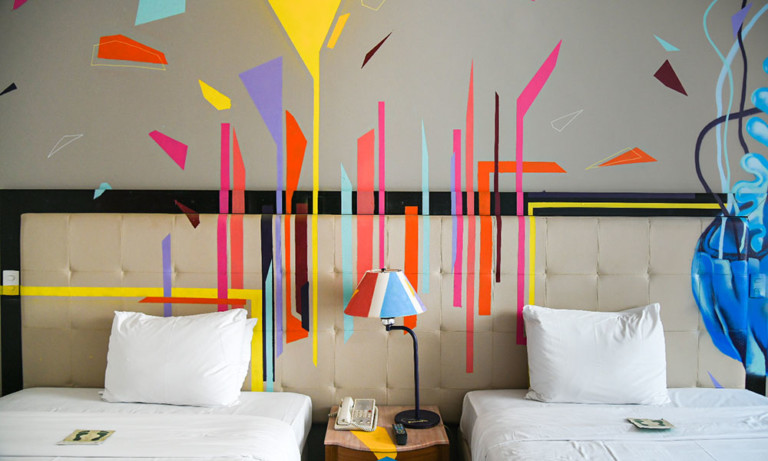 Os artistas ainda tiveram a experiência de pintar com hóspedes passando pelos corredores, como no caso de Passos, que fez uma imersão de dez dias, pintando madrugada adentro. “Já na segunda fase, que foram os quartos e aconteceu durante o isolamento social, o andar foi também vazio para que a gente pudesse trabalhar.”